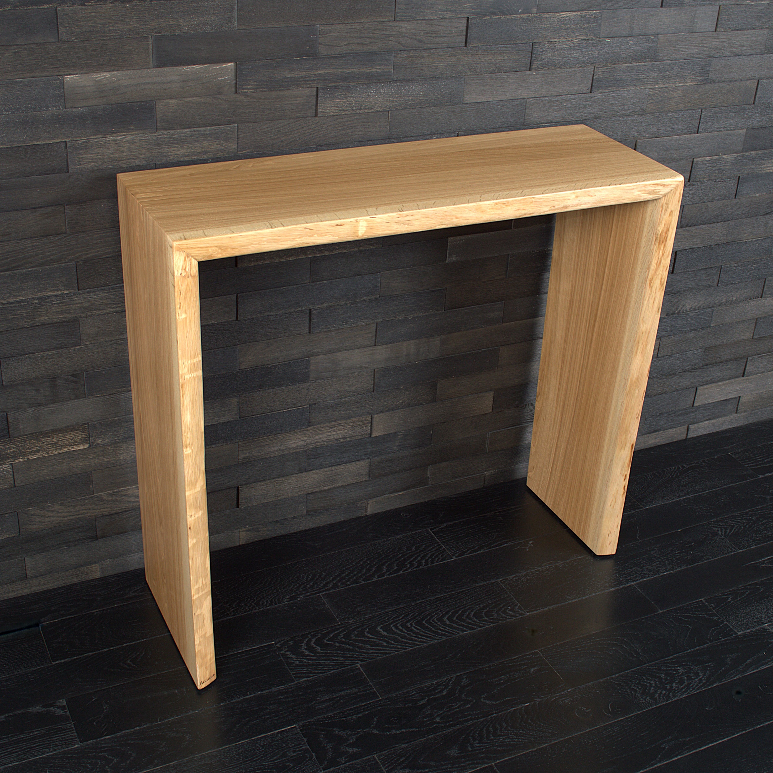 Console murale artisanale en chêne massif local, parfaite pour une entrée ou un espace déco. Avec ses montants naturellement asymétriques, elle saura sublimer votre intérieur par son caractère authentique.