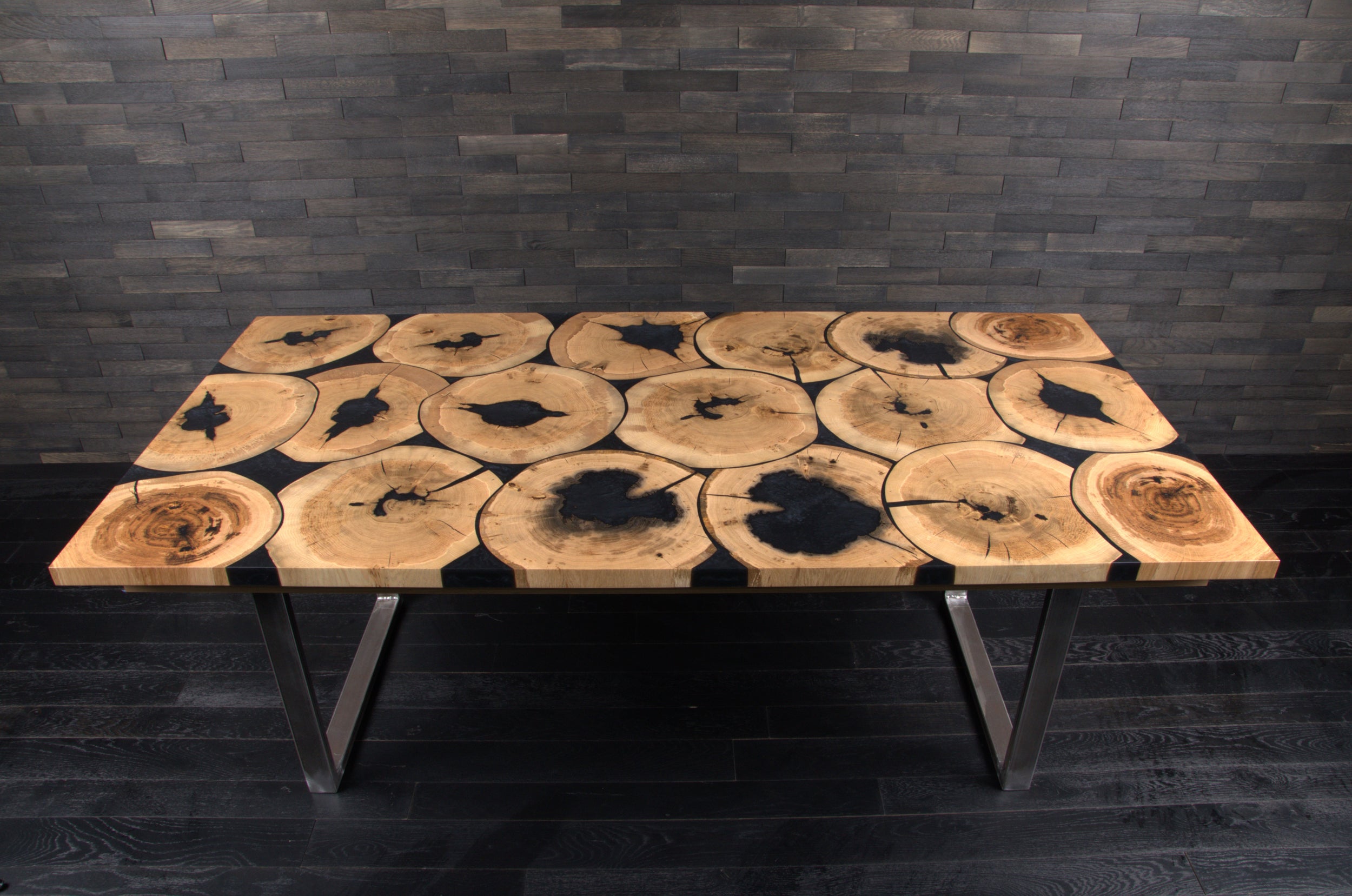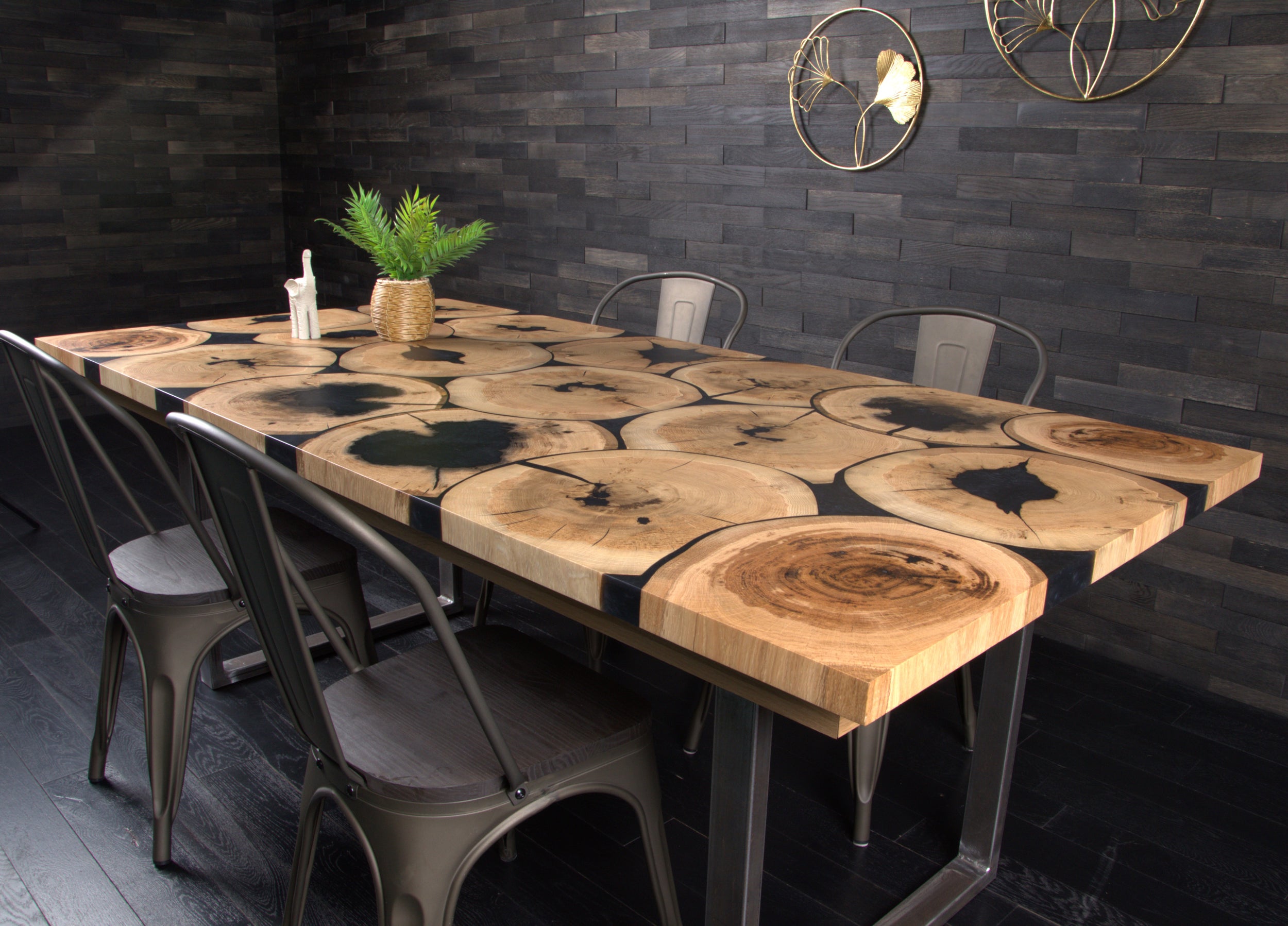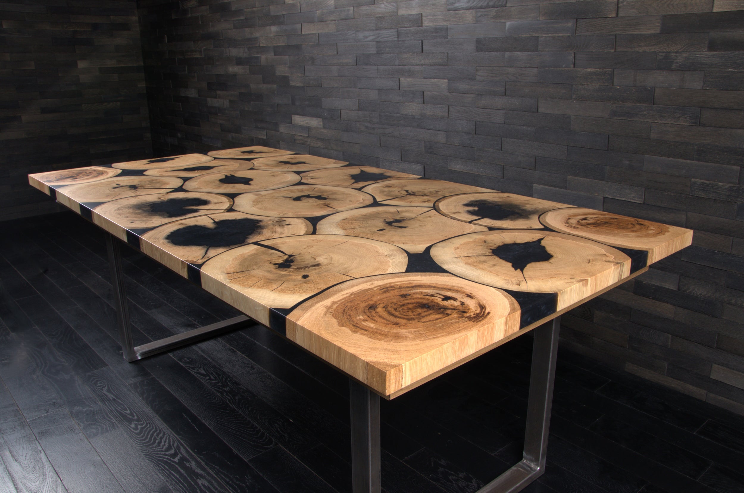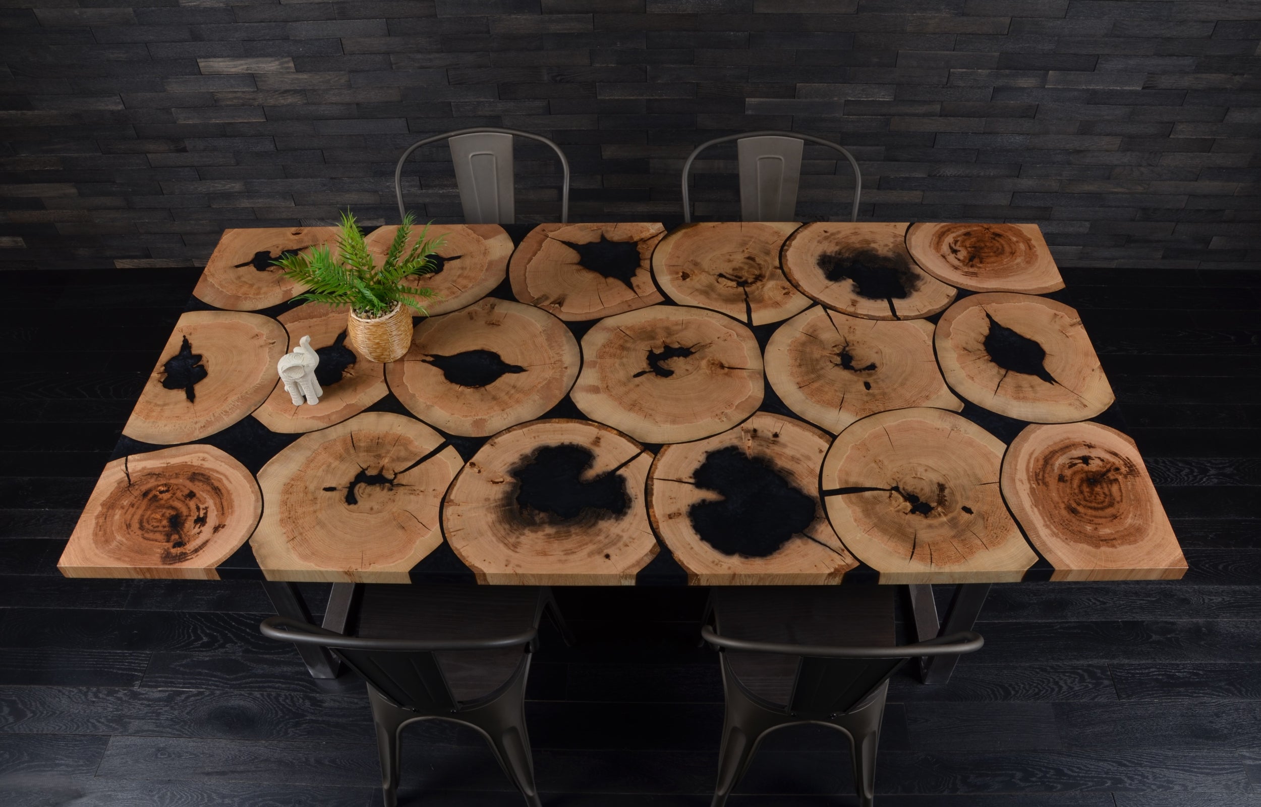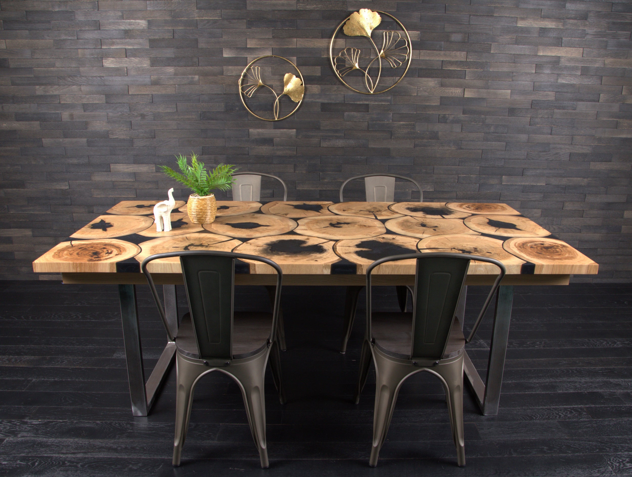 Ce plateau de table moderne pour 8 personnes incarne l'équilibre parfait entre authenticité et sophistication. Conçu avec des rondelles de chêne soigneusement sélectionnées, noyées dans sa résine époxy noire, il offre un contraste saisissant et une texture unique. Sa finition vernis mat sublime les nuances naturelles du bois tout en apportant une élégance parfaite et contemporaine. Toujours crée à la main par notre artisan menuisier.