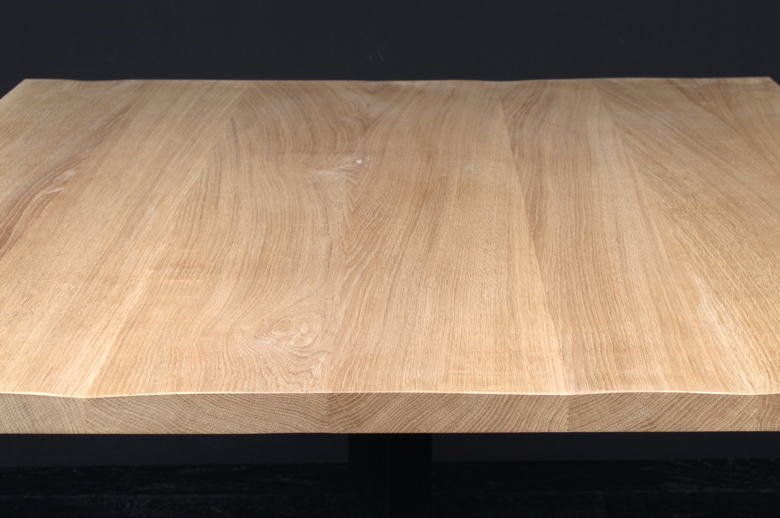 Ce plateau carré en chêne français de 1200 mm de côté, avec ses bords droits, est parfait pour accueillir jusqu'à 8 personnes. Son design allie légères ondulations de surface et lignes nettes, offrant une esthétique à la fois industrielle et traditionnelle. Chaque pièce de bois massif ayant composé le plateau est unique, révélant ainsi toute la richesse du matériau. Prêt à être fini avec une patine, un vernis ou une huile.