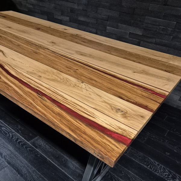 - Design audacieux : contraste naturel du chêne et de la résine rouge
