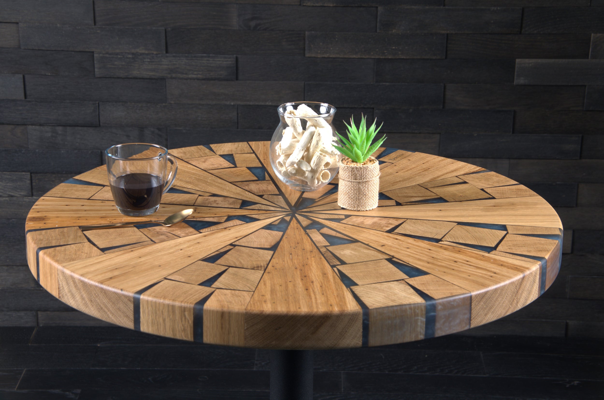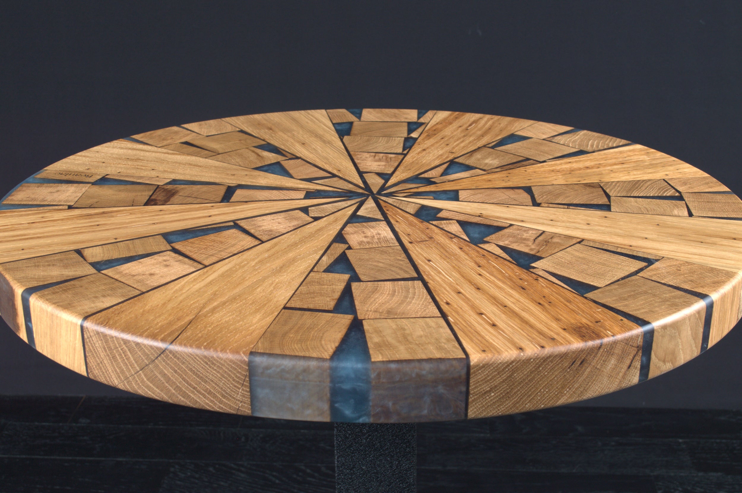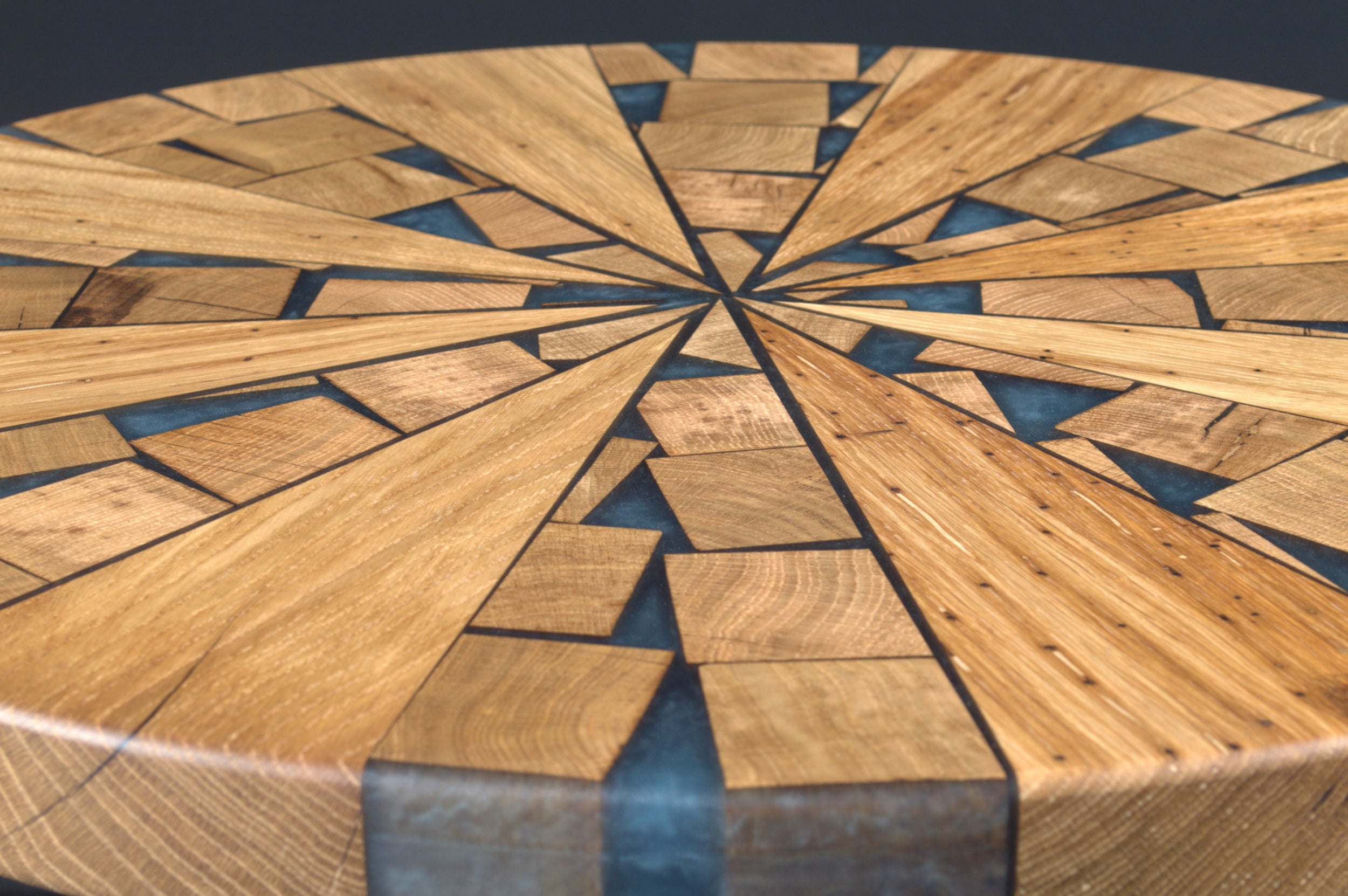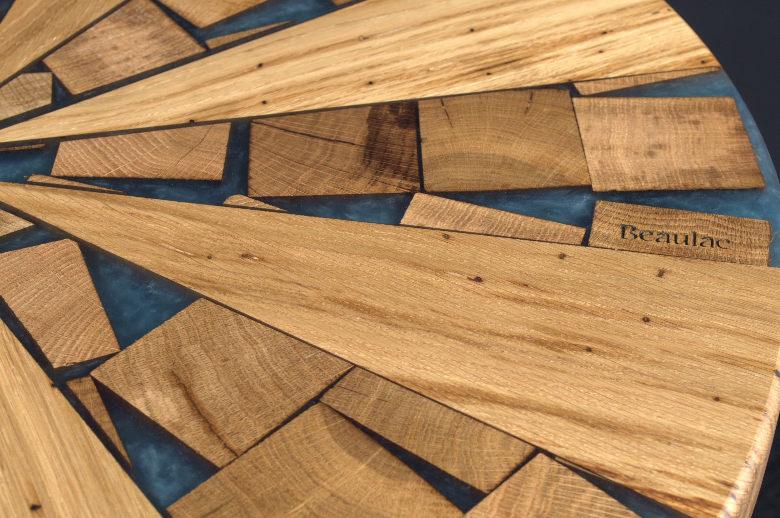 Les altérations biologiques présentes sur les bois, ayant longtemps reposé au sol en forêt, se transforment ici en atouts esthétiques. Incrustée entre les fragments de chêne, notre résine English Sky crée un contraste subtil avec les teintes chaudes du chêne.