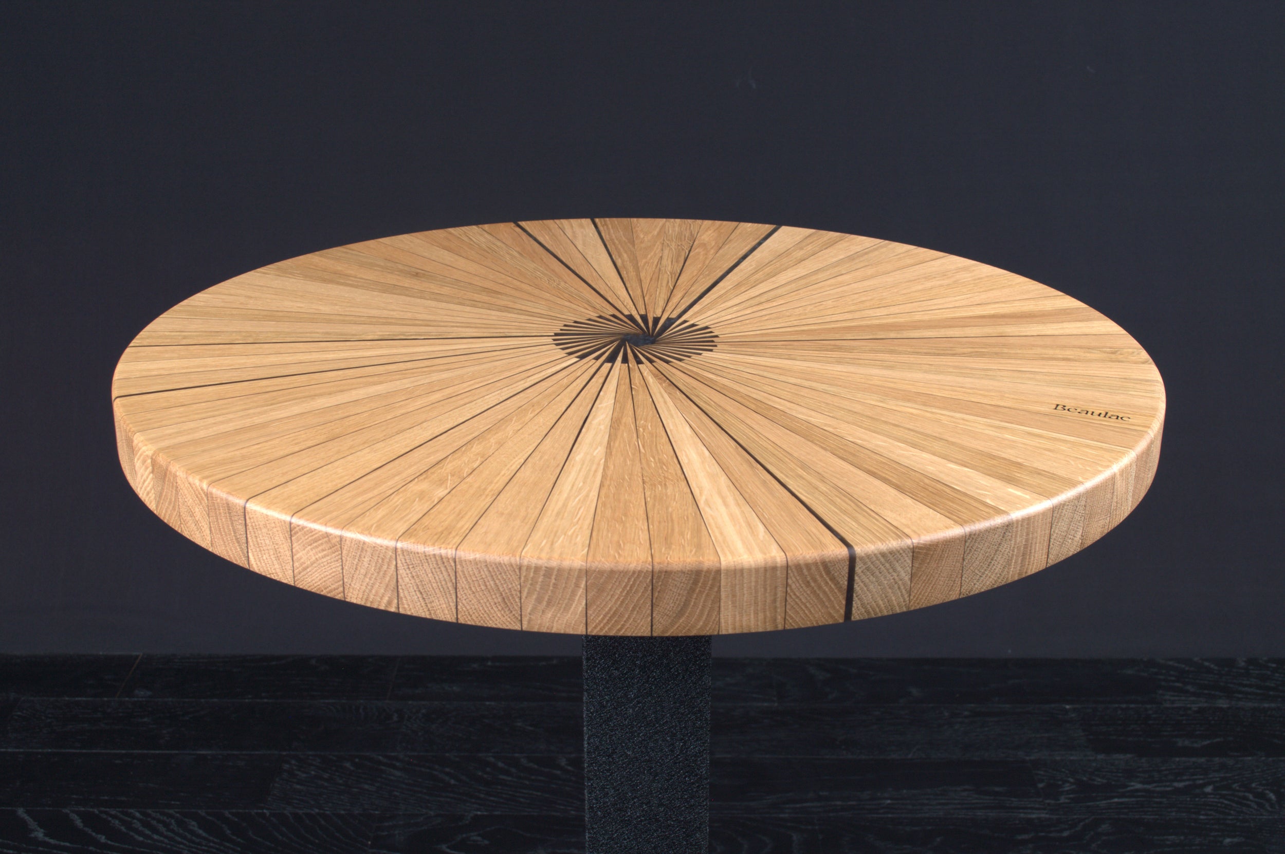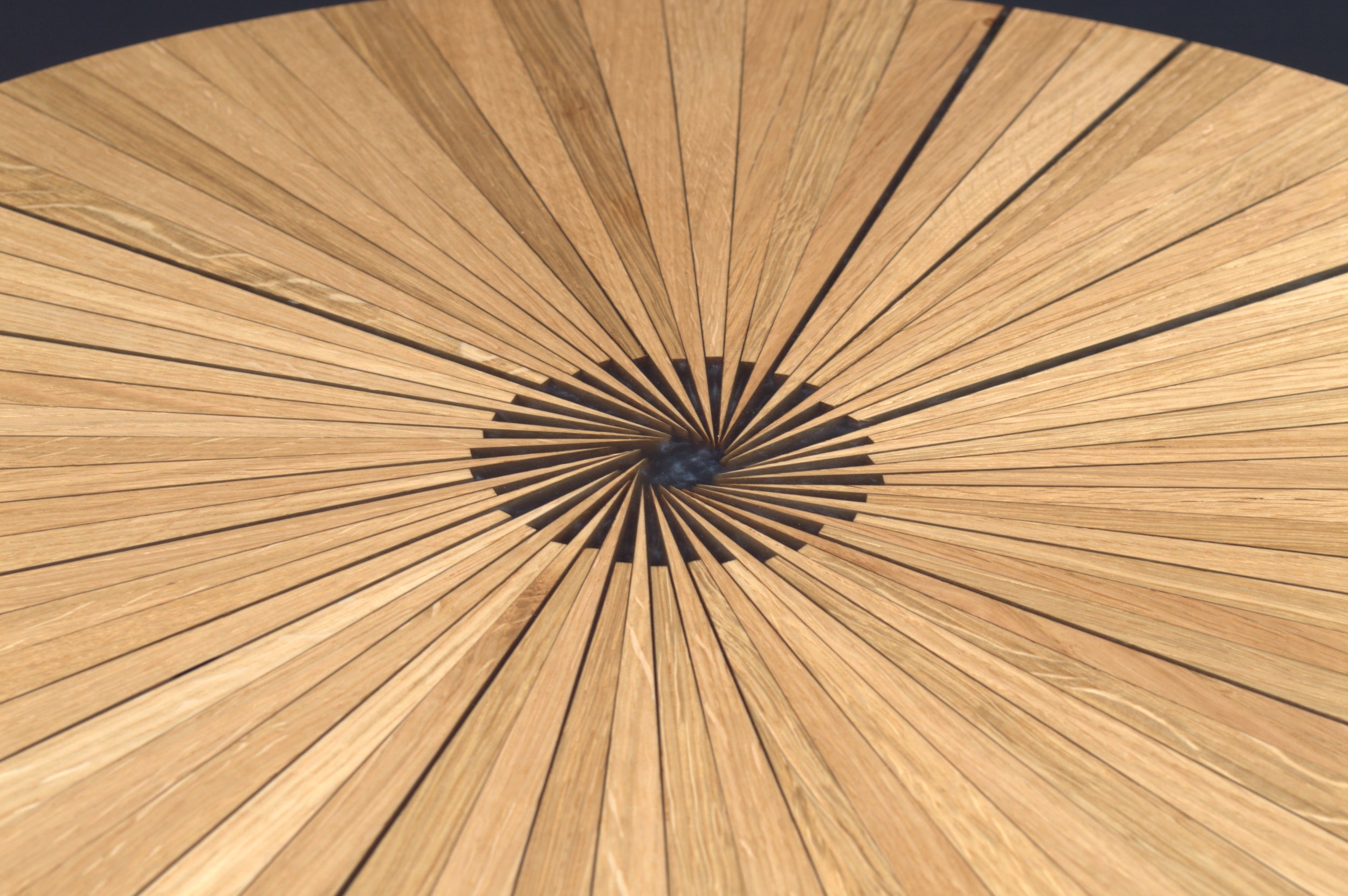 Ce plateau rond en chêne et résine STERLING GRAY, baptisé « Soleil », est une véritable pièce d'artisanat. Il met en lumière des fragments de bois soigneusement taillés et assemblés à la main pour former un motif harmonieux et rayonnant.
