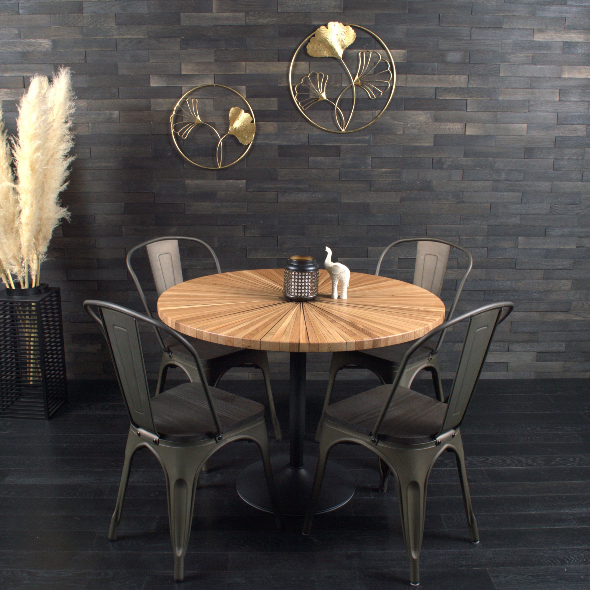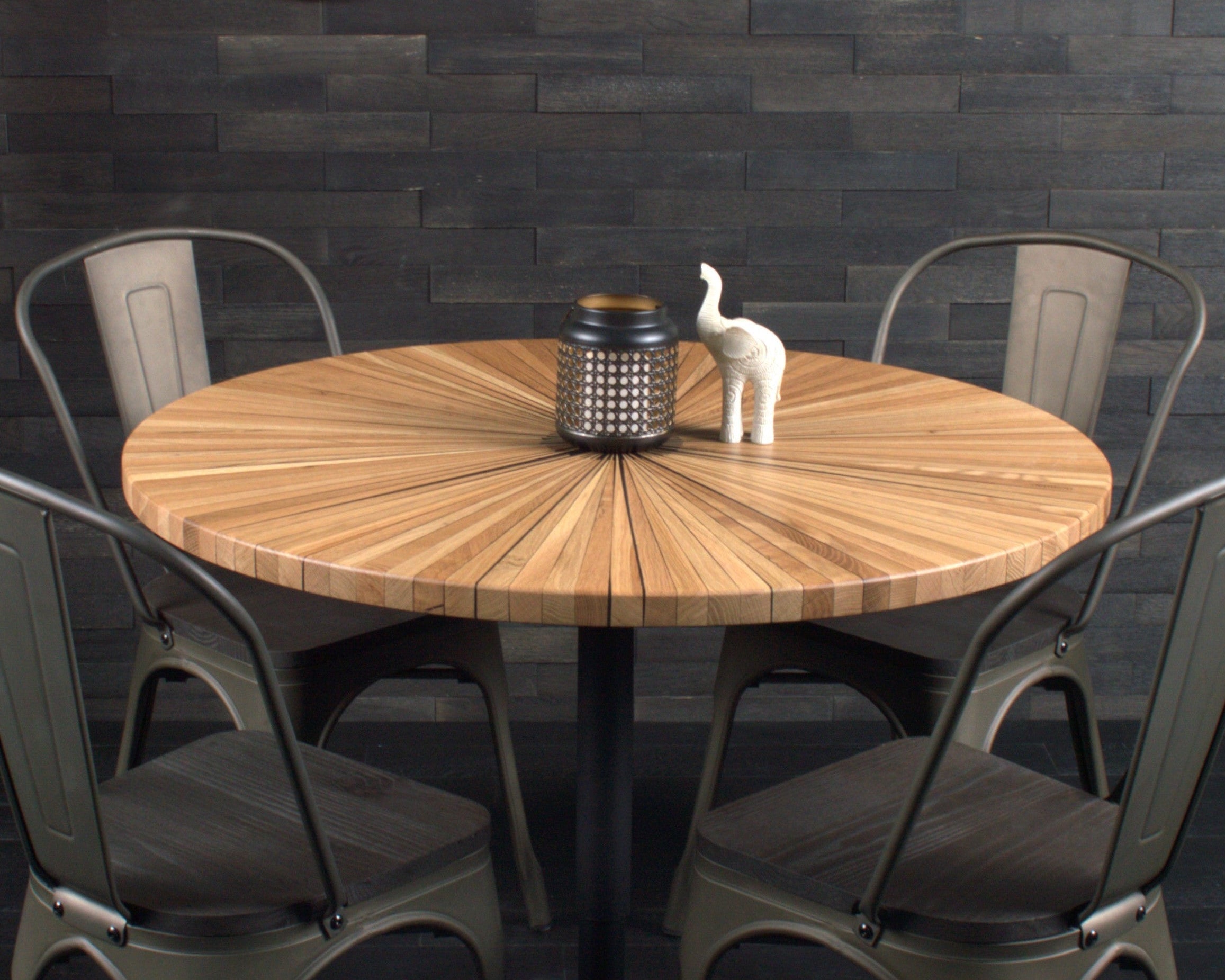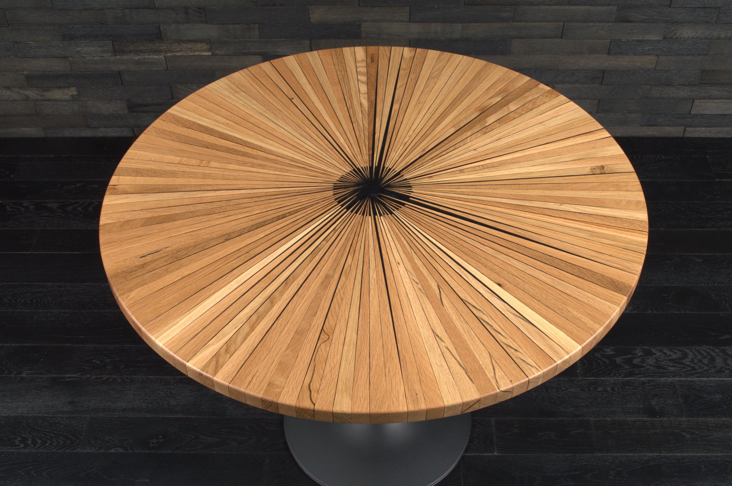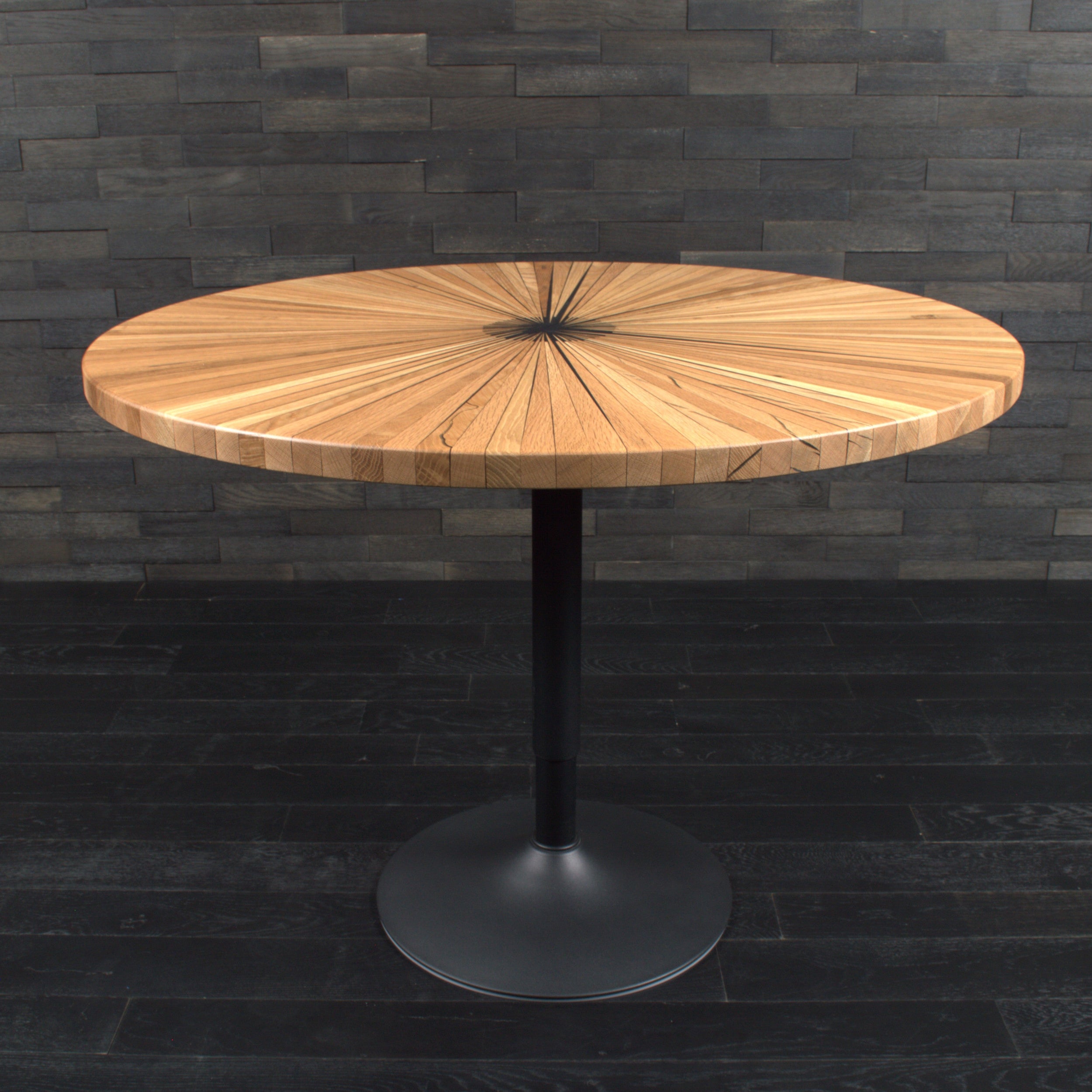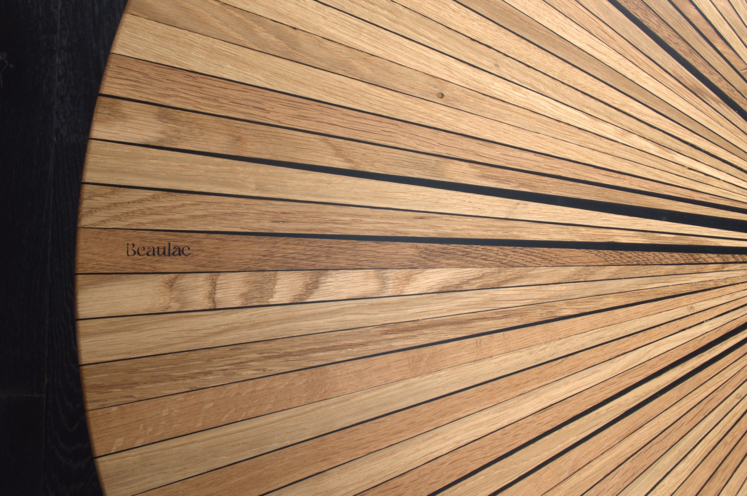 Ce plateau rond en chêne et résine WET ASPHALT, baptisé « Soleil », est une véritable pièce d'artisanat. Il met en lumière des fragments de bois soigneusement taillés et assemblés à la main pour former un motif rayonnant.