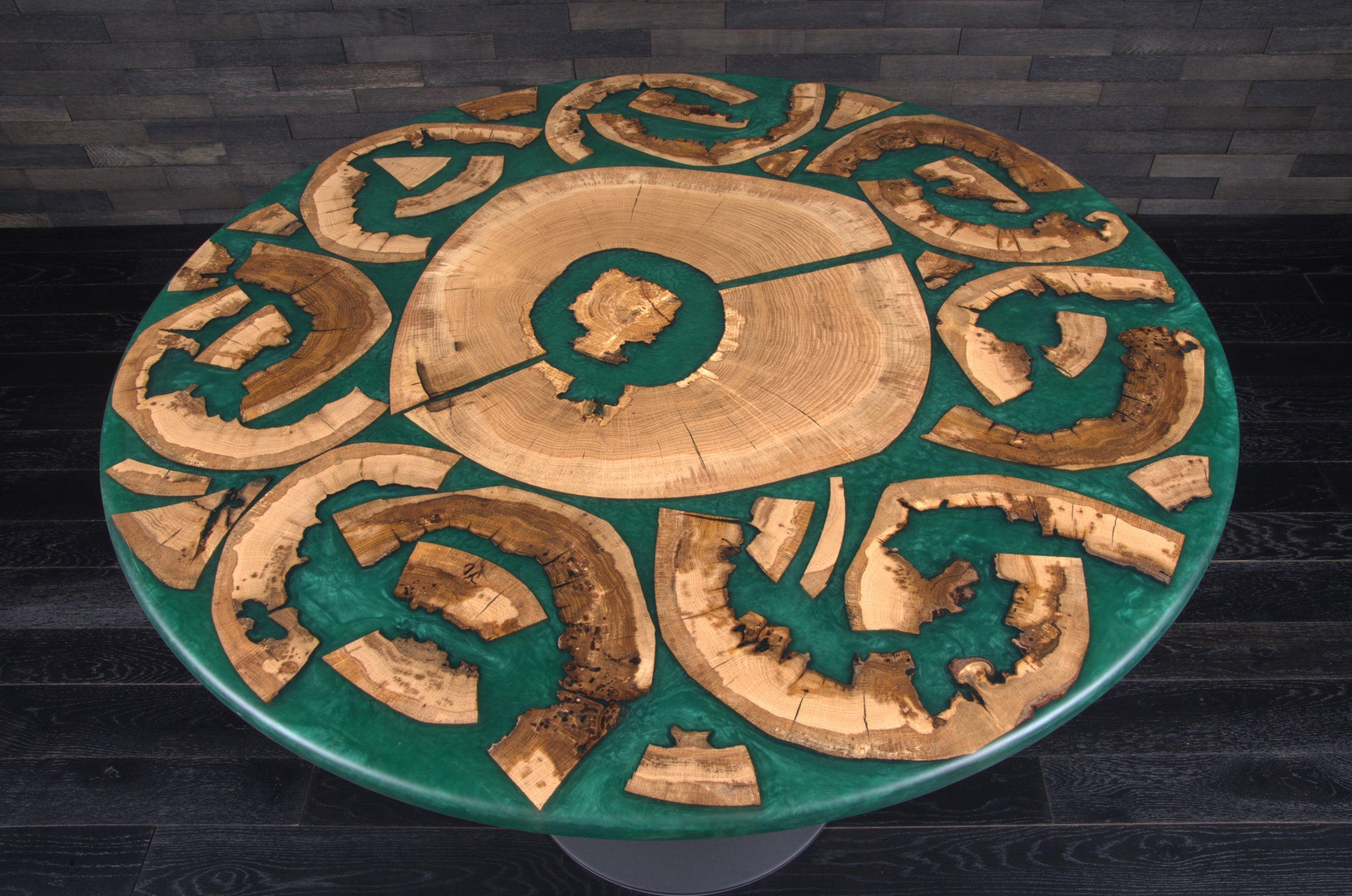 Plateau rond résine "underworldteal" tranches de chêne diam 1020 (A087)