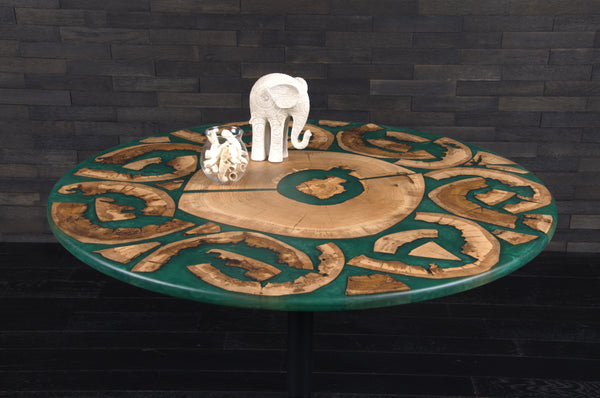Ce magnifique plateau de table rond en résine couleur jade, sublimé par des tranches de chêne intégrées, crée un contraste harmonieux entre la transparence de la résine et la chaleur naturelle du bois. Conçu pour accueillir jusqu’à 4 personnes, il offre un espace de repas à la fois confortable et esthétique.