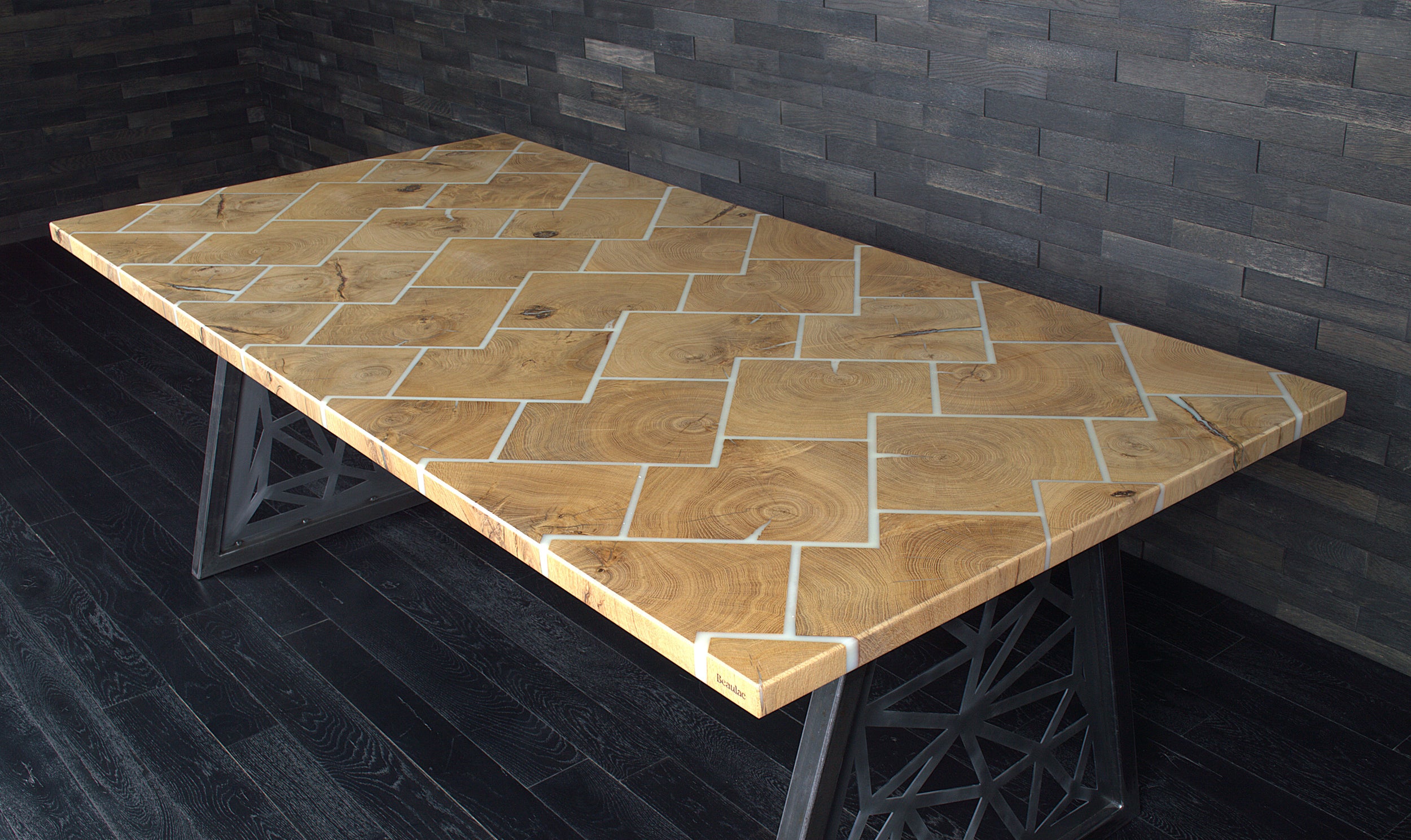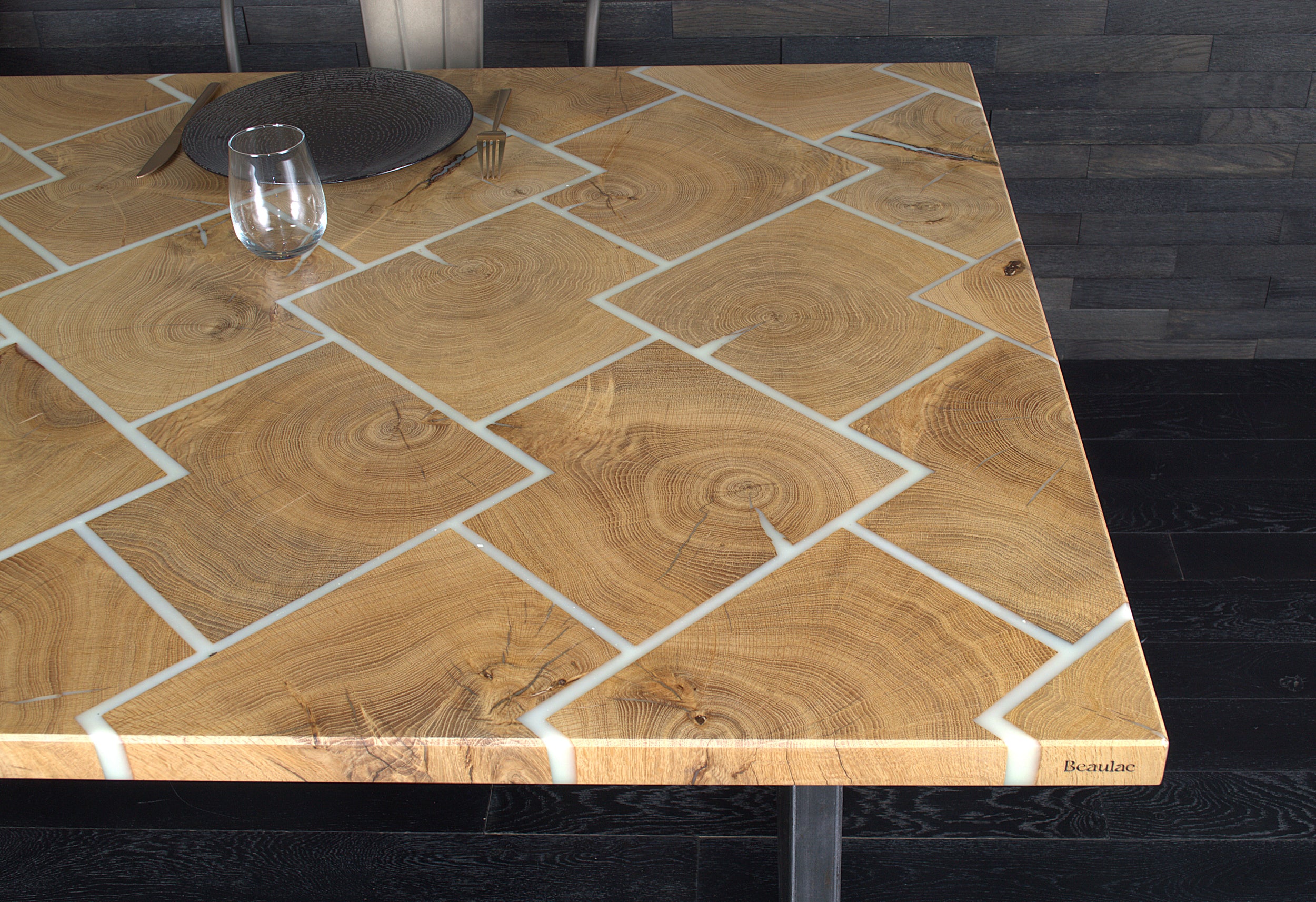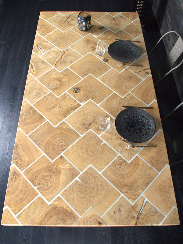 Table chêne "Bâton rompu" résine BLACKICE 1995 X 995 mm (A082)