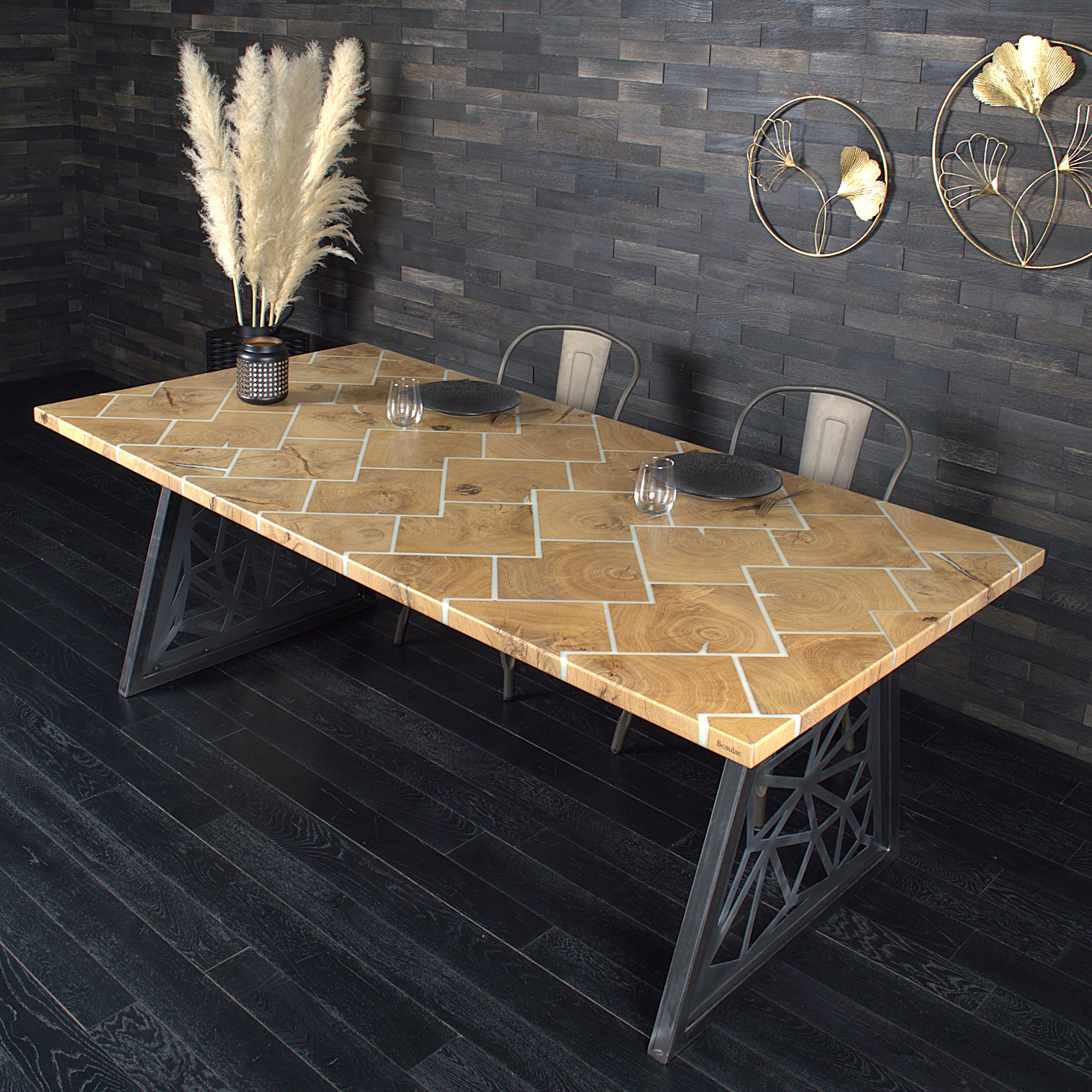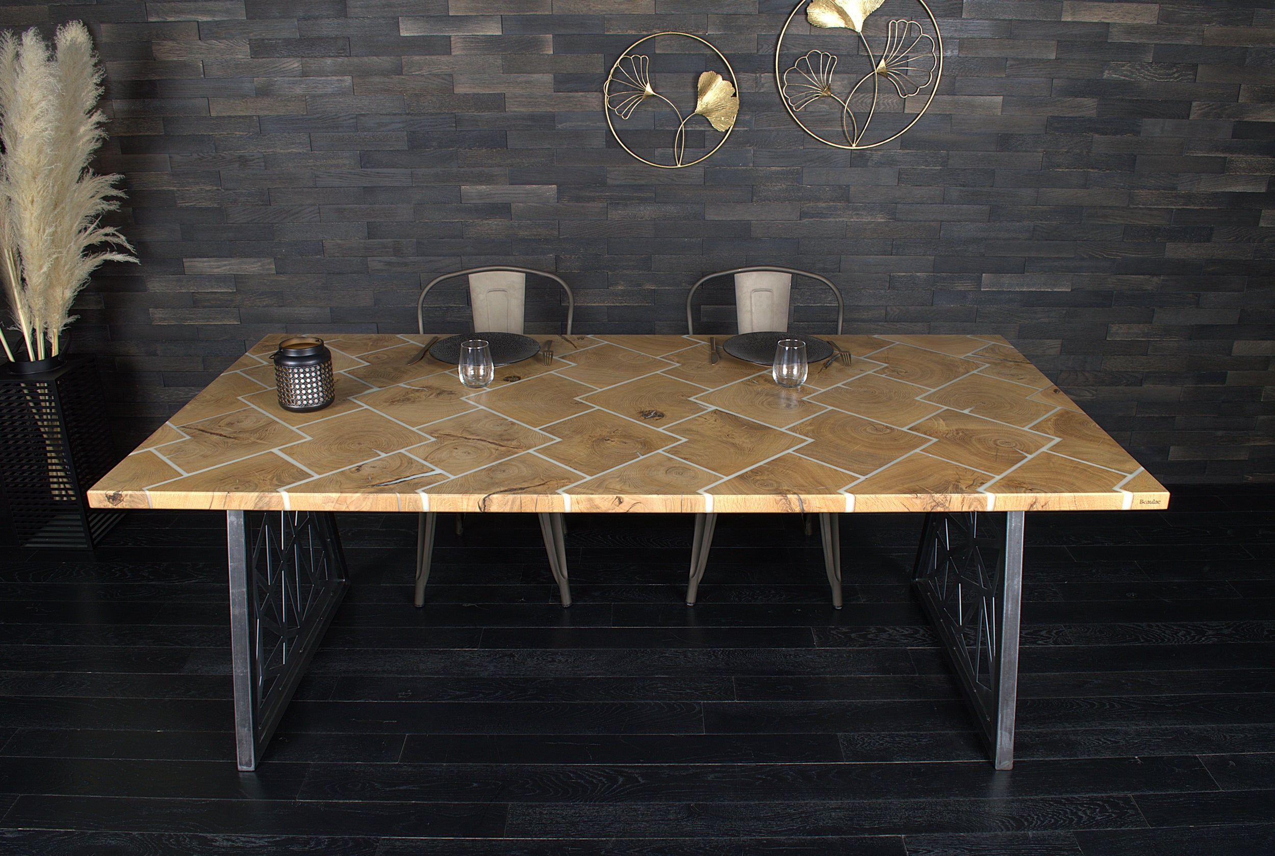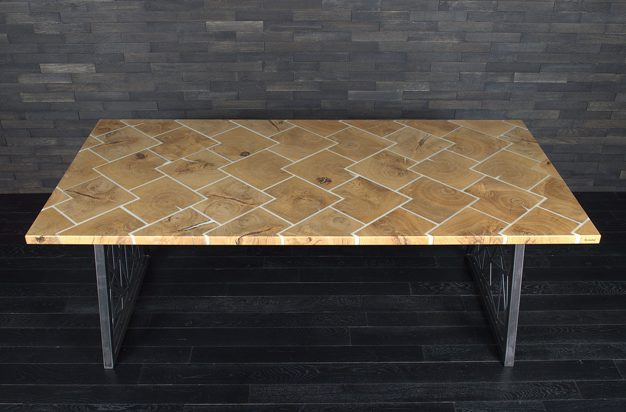 Table chêne "Bâton rompu" résine BLACKICE 1995 X 995 mm (A082)