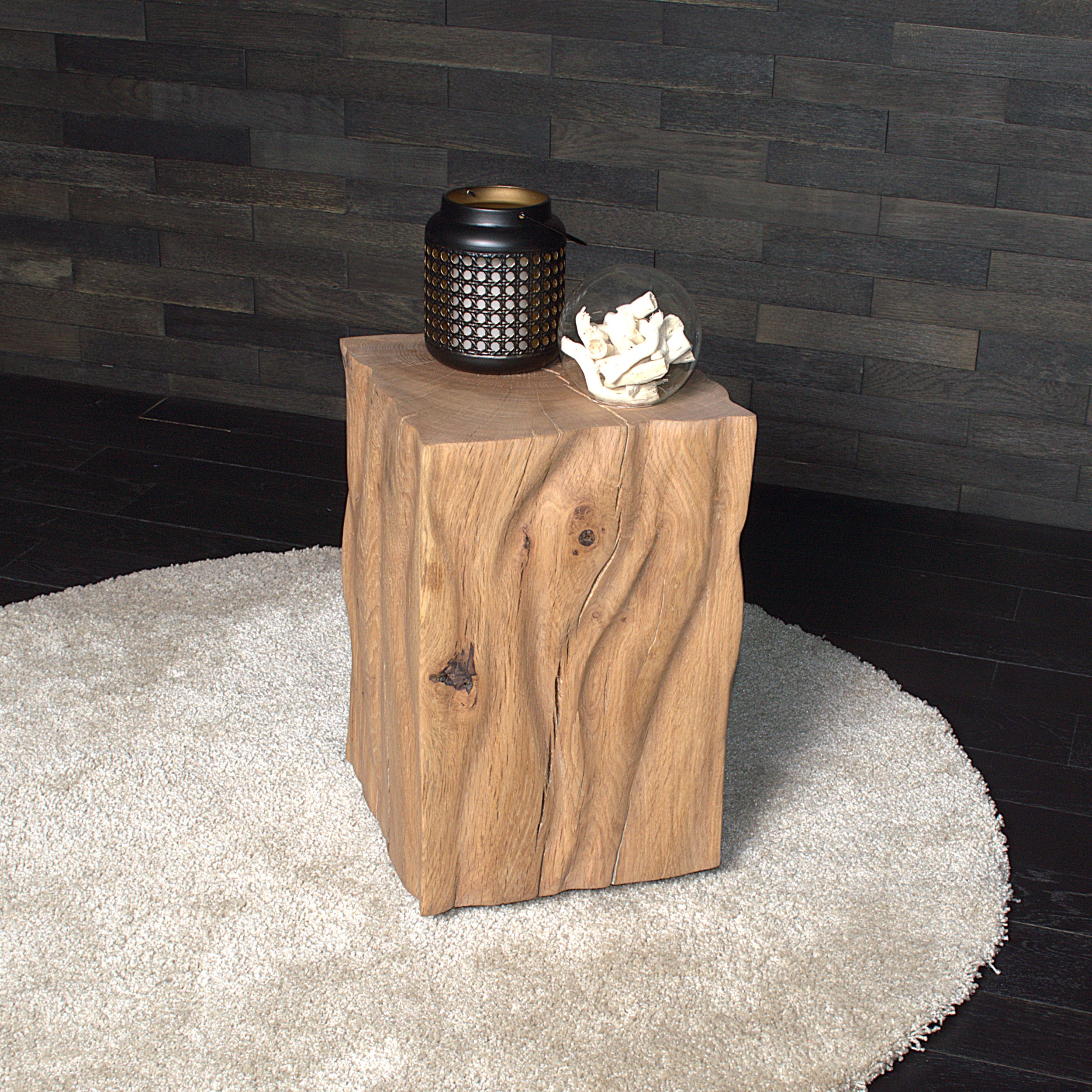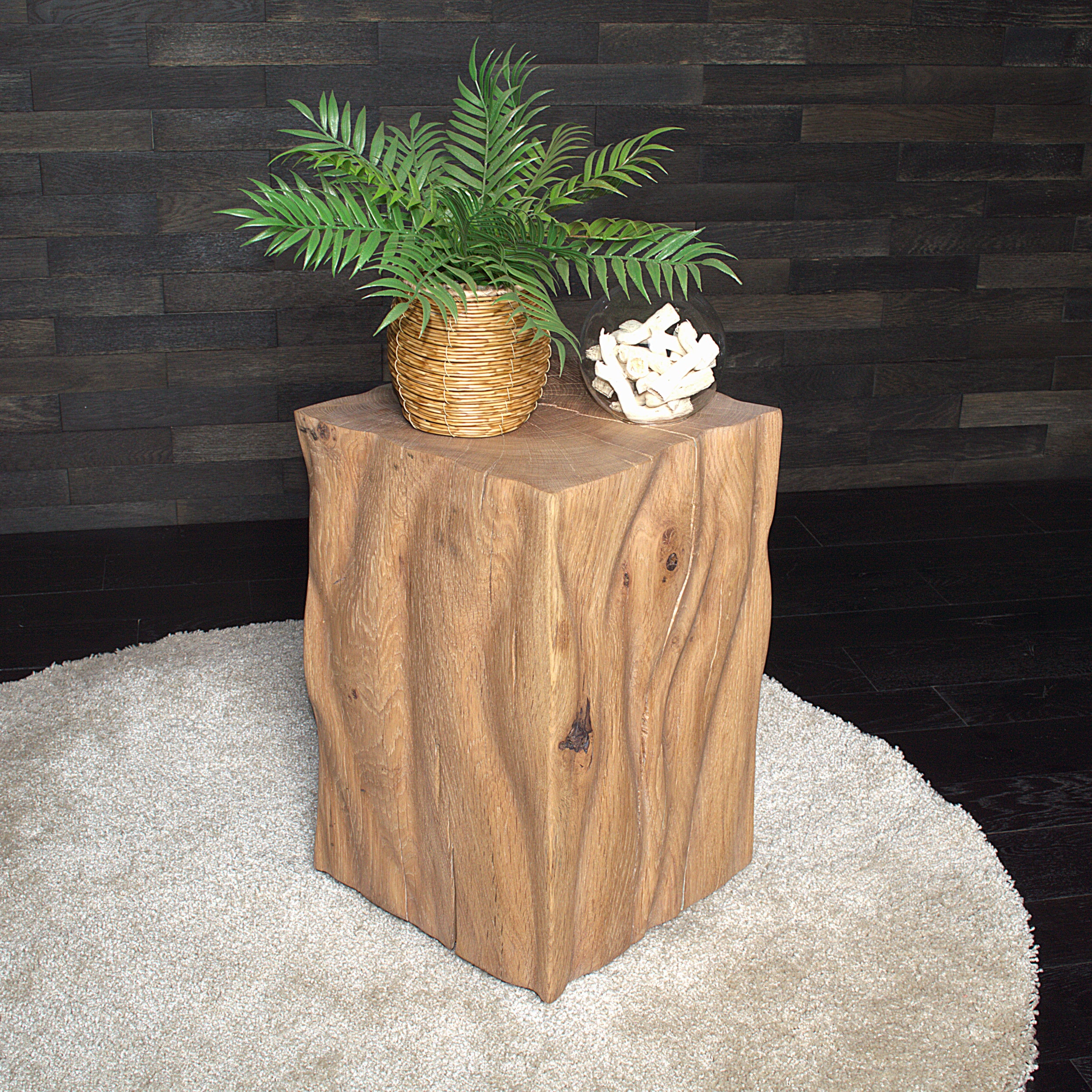 Conçu en chêne massif, chaque bloc présente un veinage unique, avec nœuds et fissures naturelles qui soulignent l’authenticité du matériau. Son format (300 x 300 mm, hauteur 450 mm) s’intègre facilement dans tous les espaces.