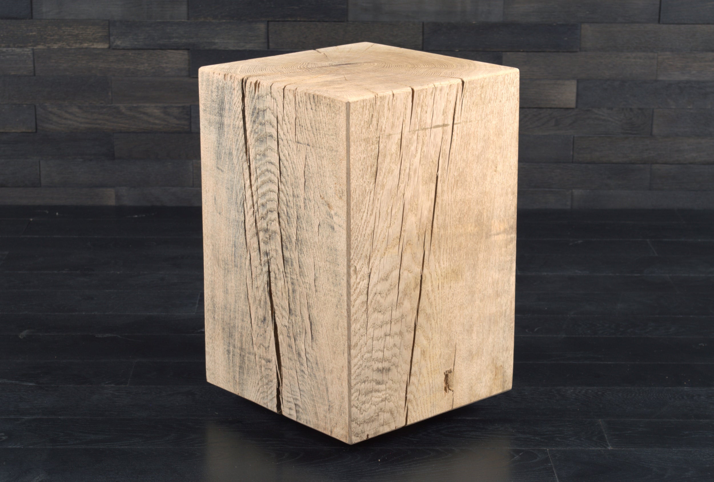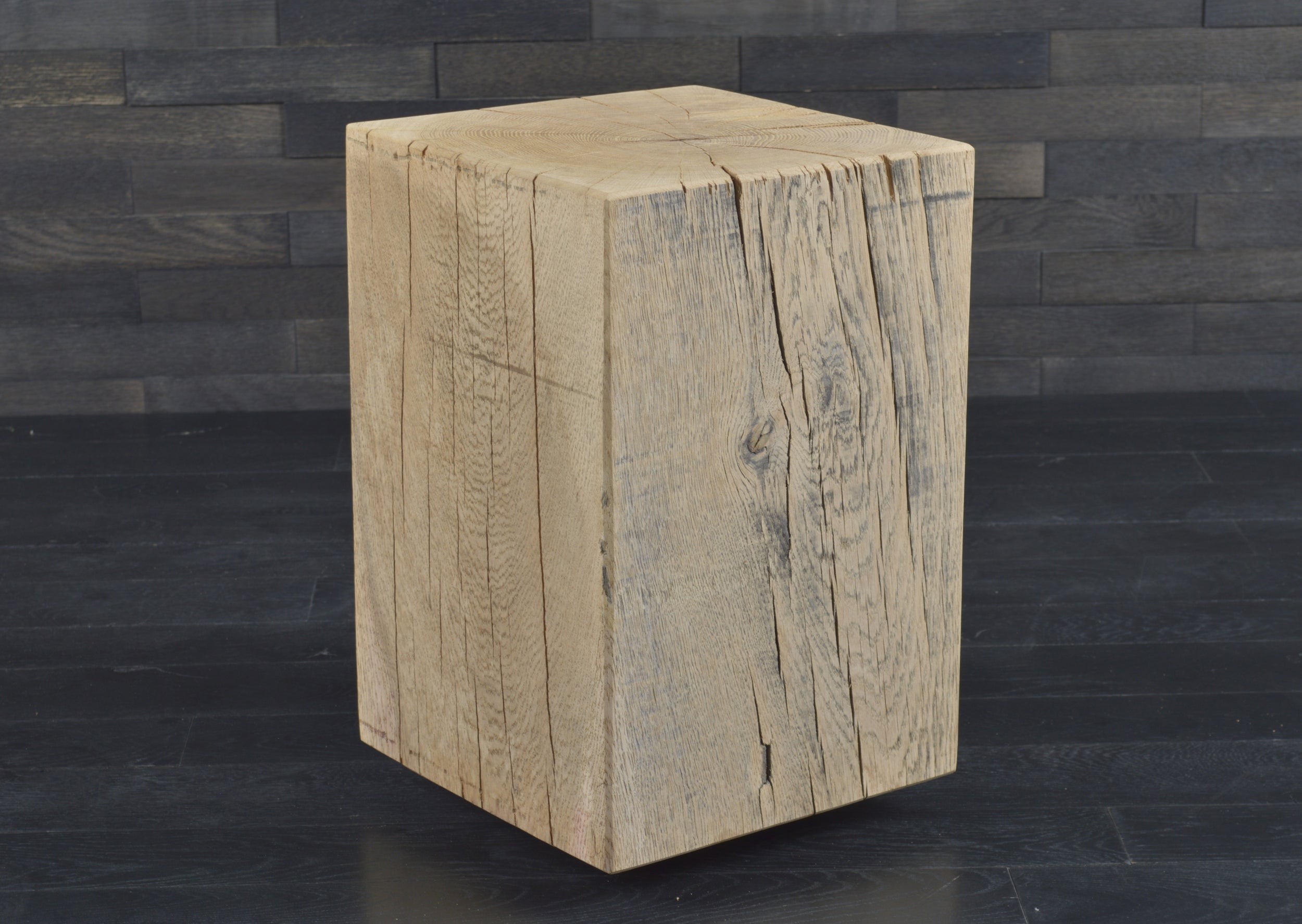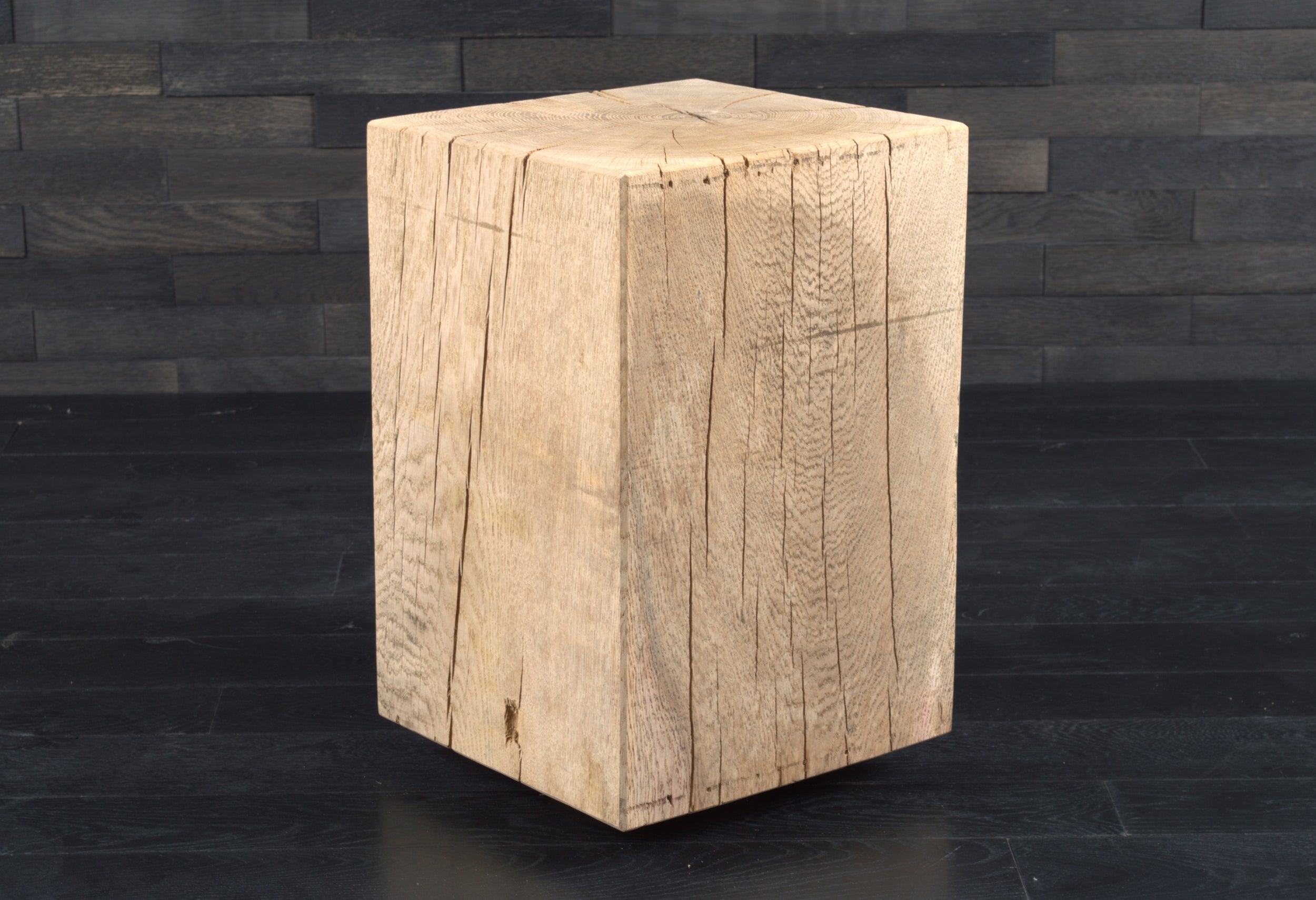 Conçu en chêne massif, chaque bloc présente un veinage unique, avec nœuds et fissures naturelles qui soulignent l’authenticité du matériau. Son format (300 x 300 mm, hauteur 450 mm) s’intègre facilement dans tous les espaces.