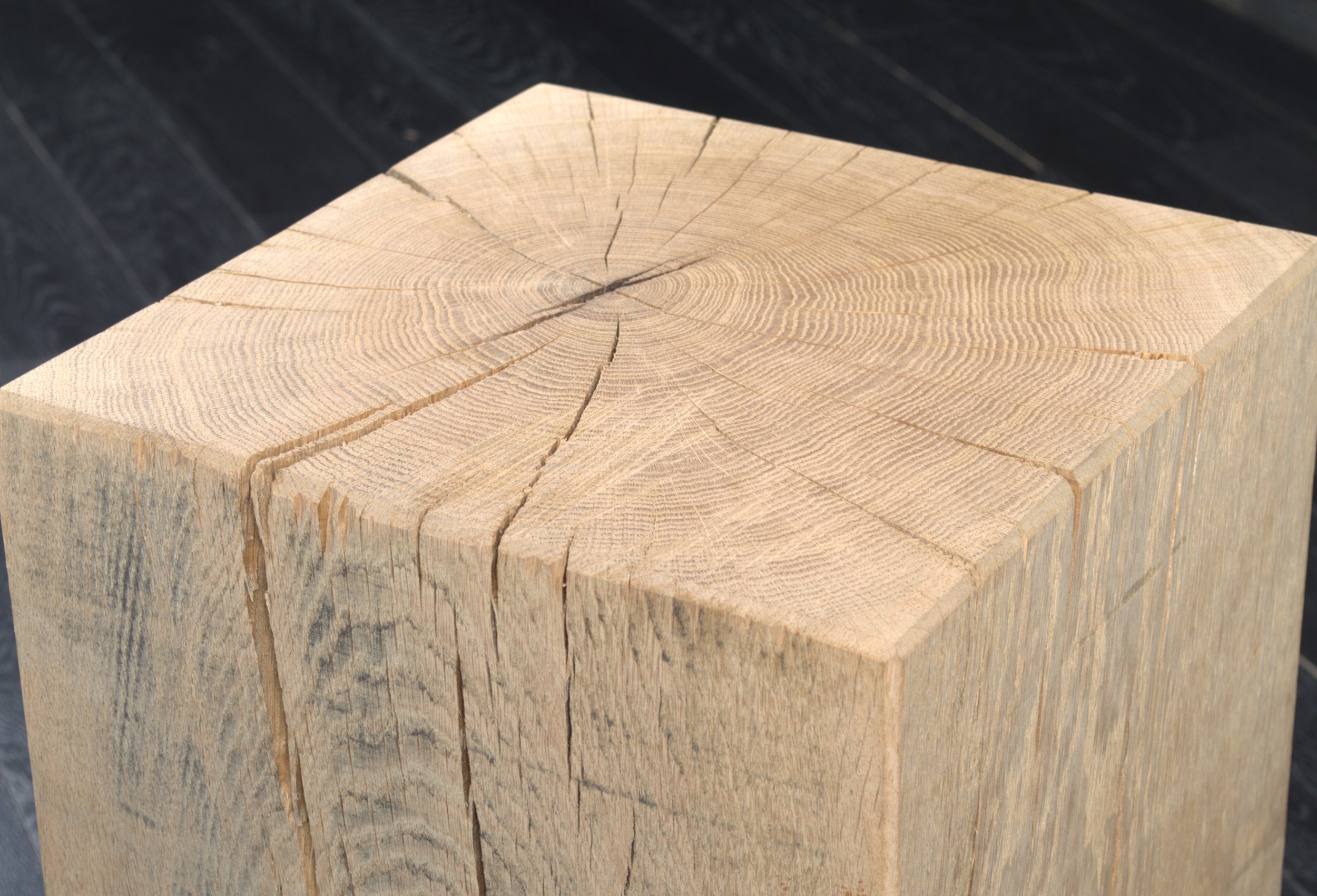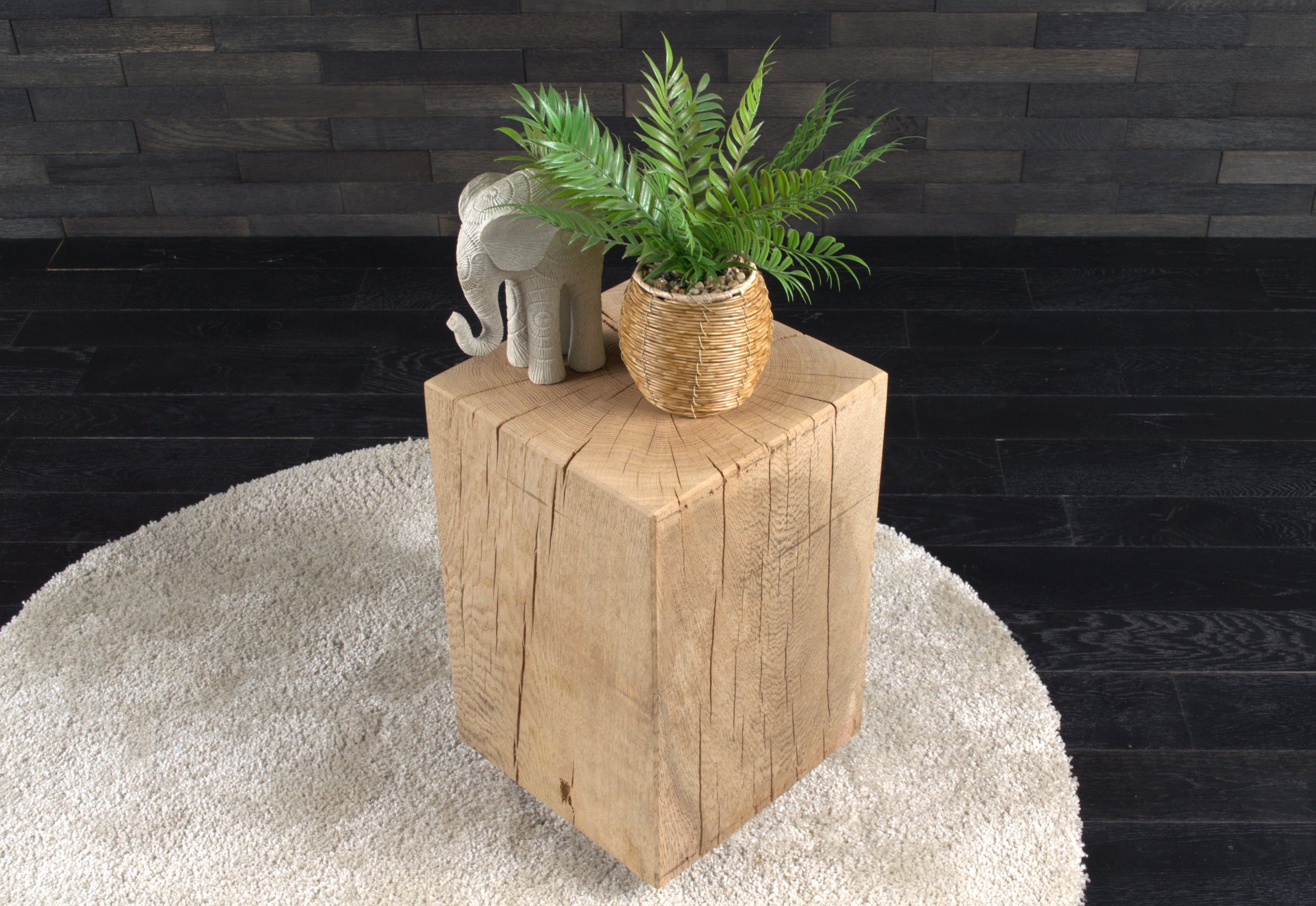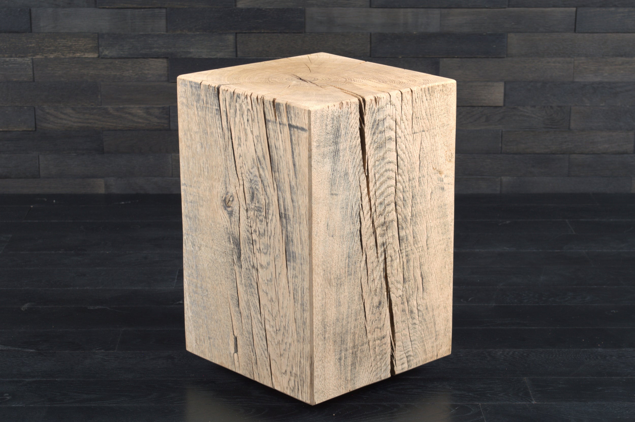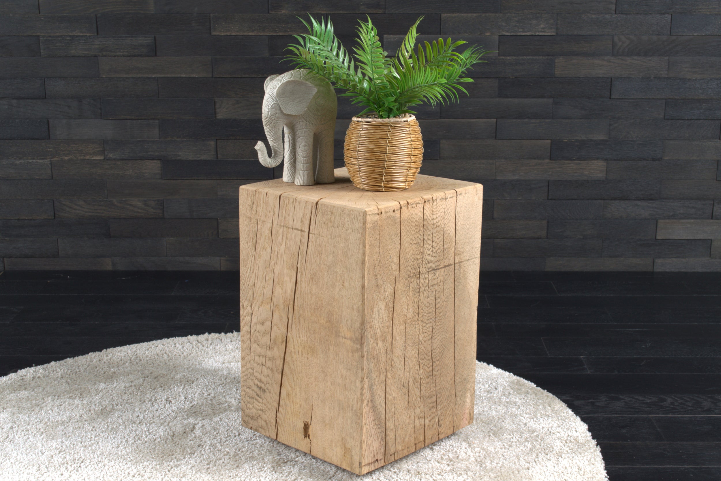 Conçu en chêne massif, chaque bloc présente un veinage unique, avec nœuds et fissures naturelles qui soulignent l’authenticité du matériau. Son format (300 x 300 mm, hauteur 450 mm) s’intègre facilement dans tous les espaces.