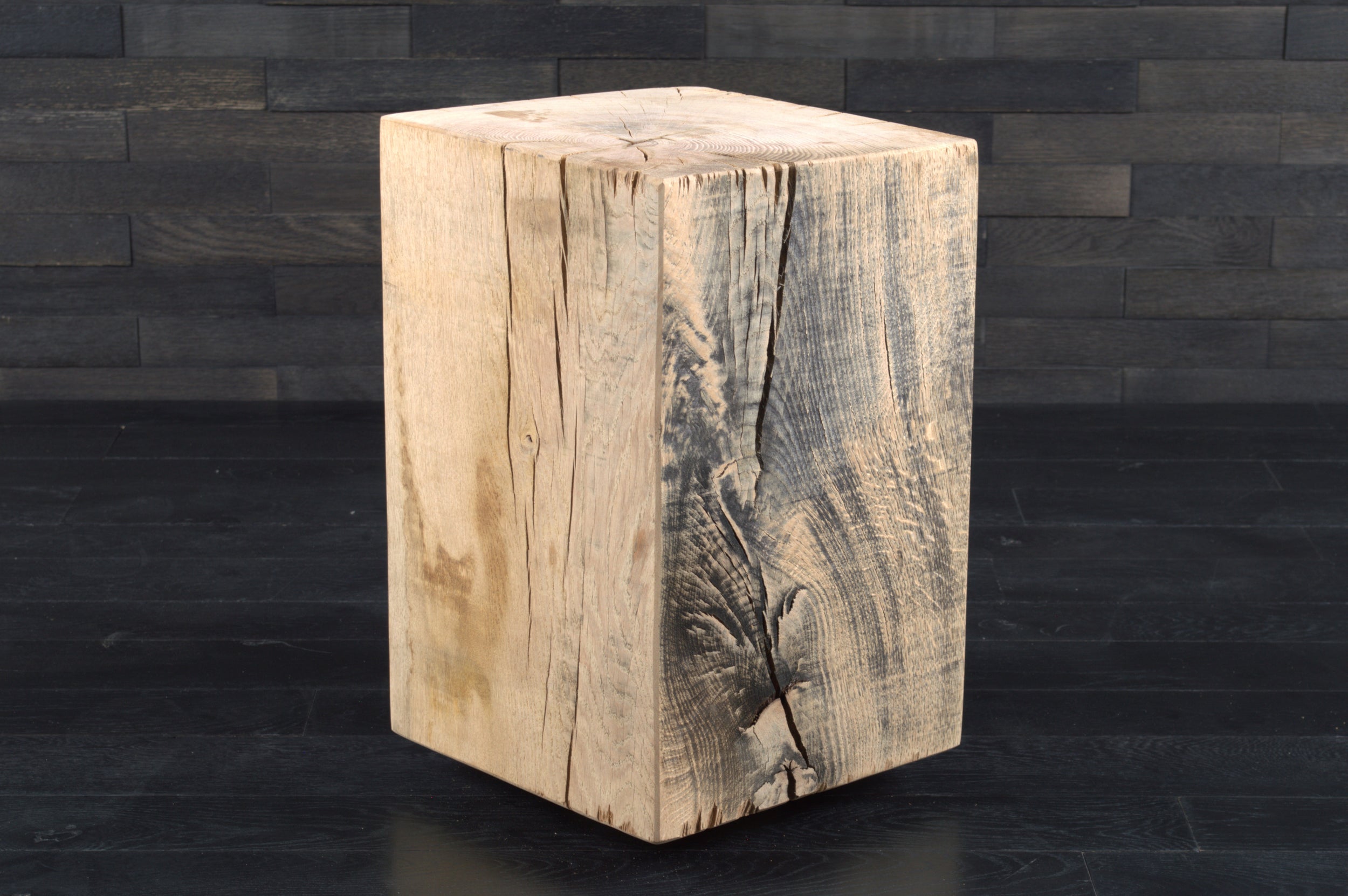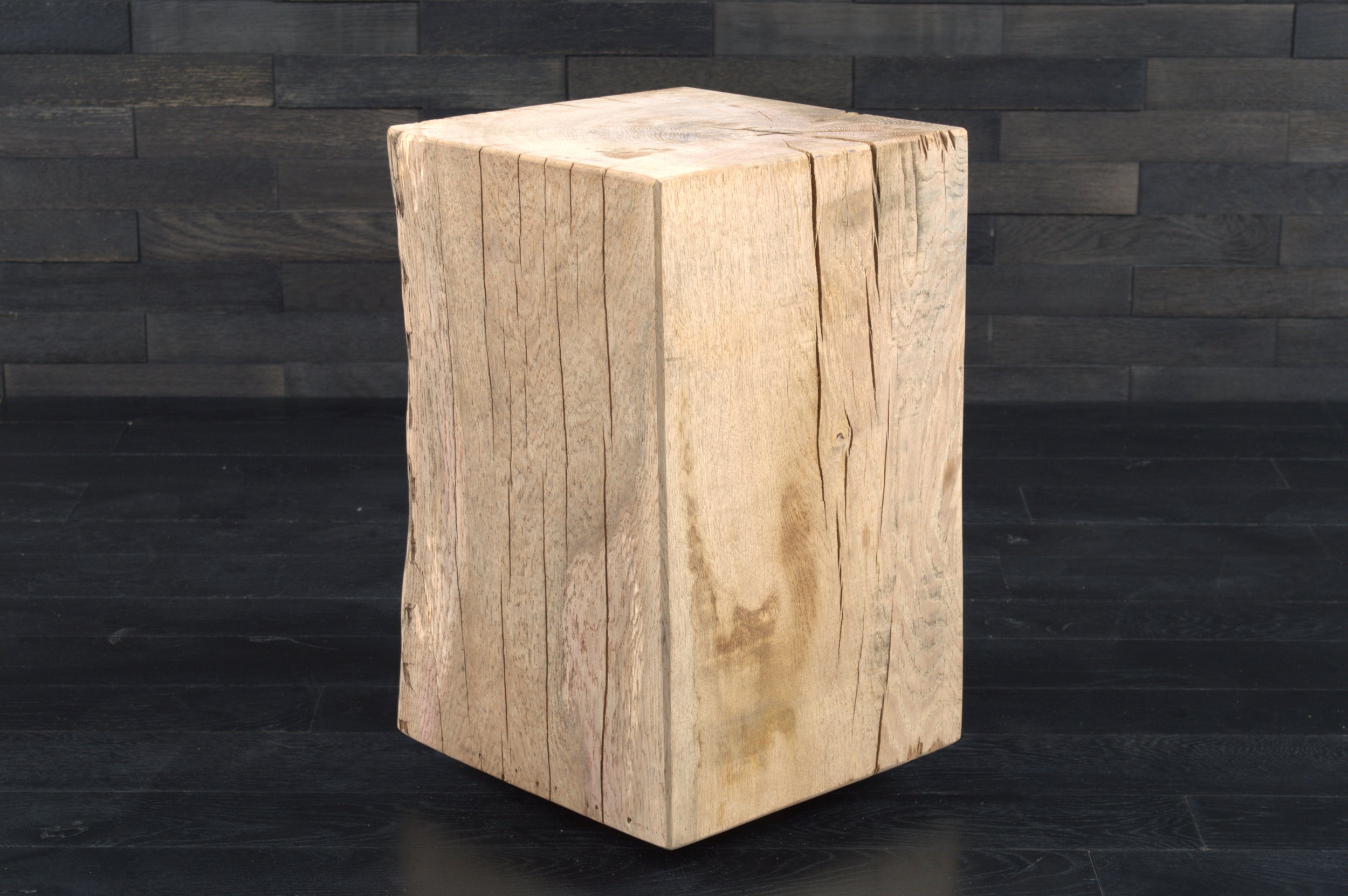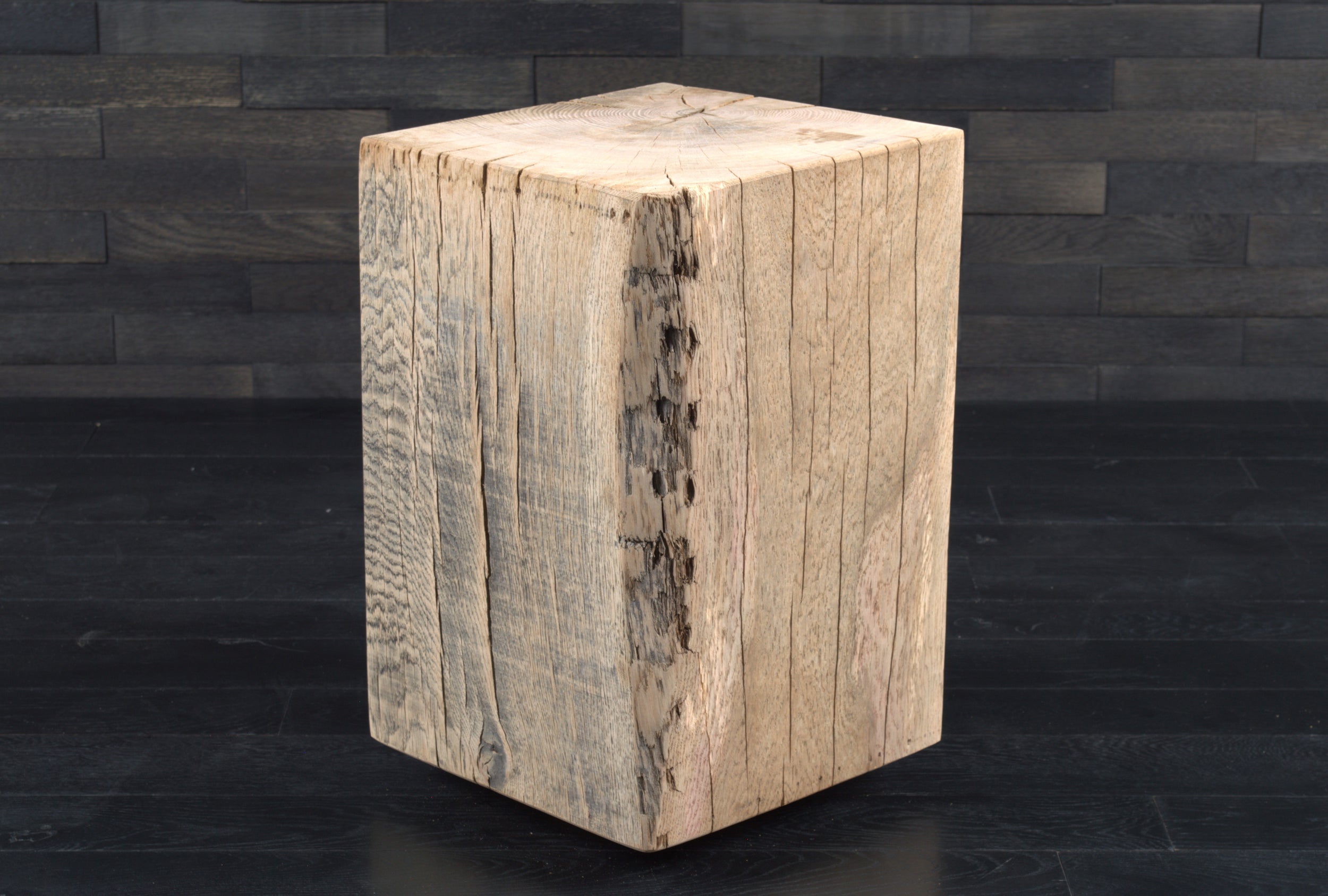 Conçu en chêne massif, chaque bloc présente un veinage unique, avec nœuds et fissures naturelles qui soulignent l’authenticité du matériau. Son format (300 x 300 mm, hauteur 450 mm) s’intègre facilement dans tous les espaces.