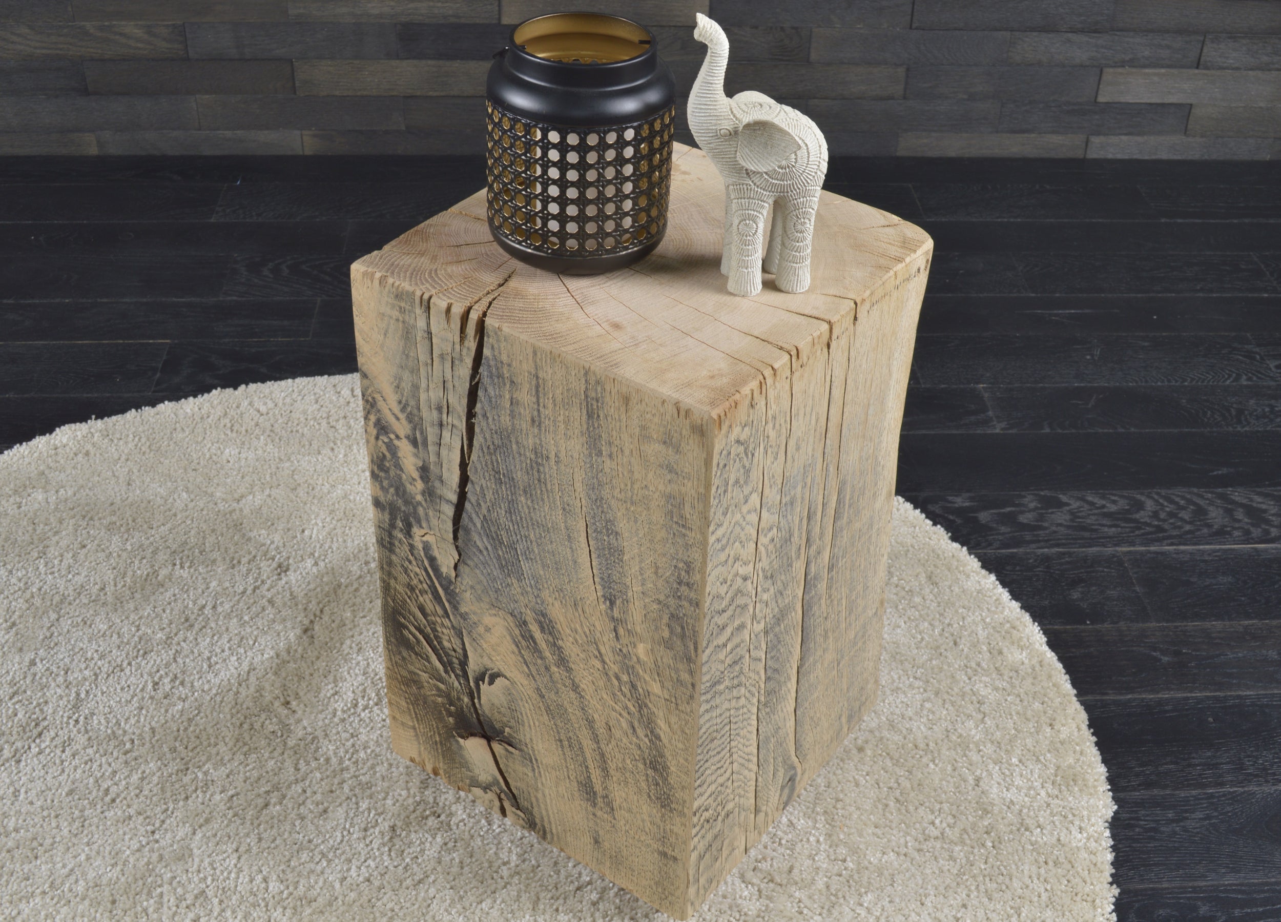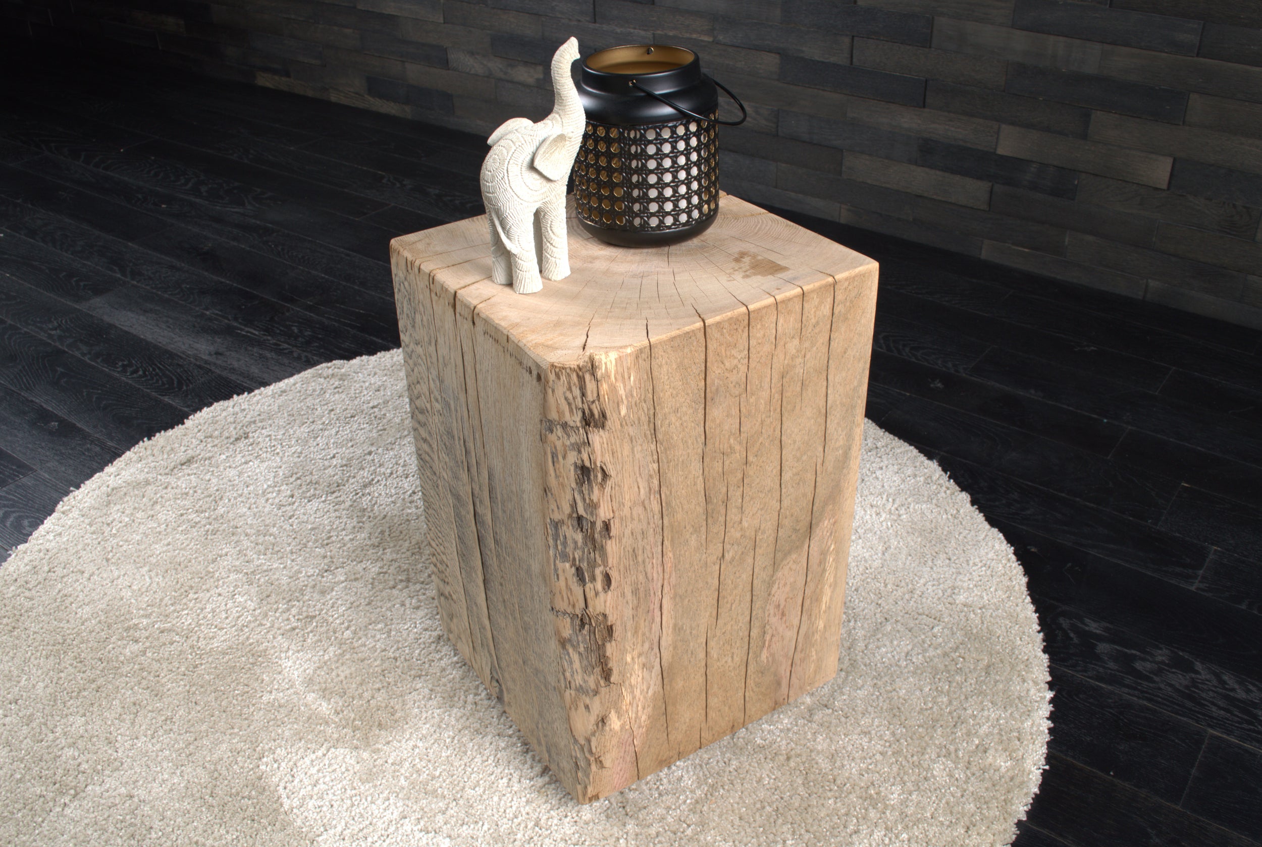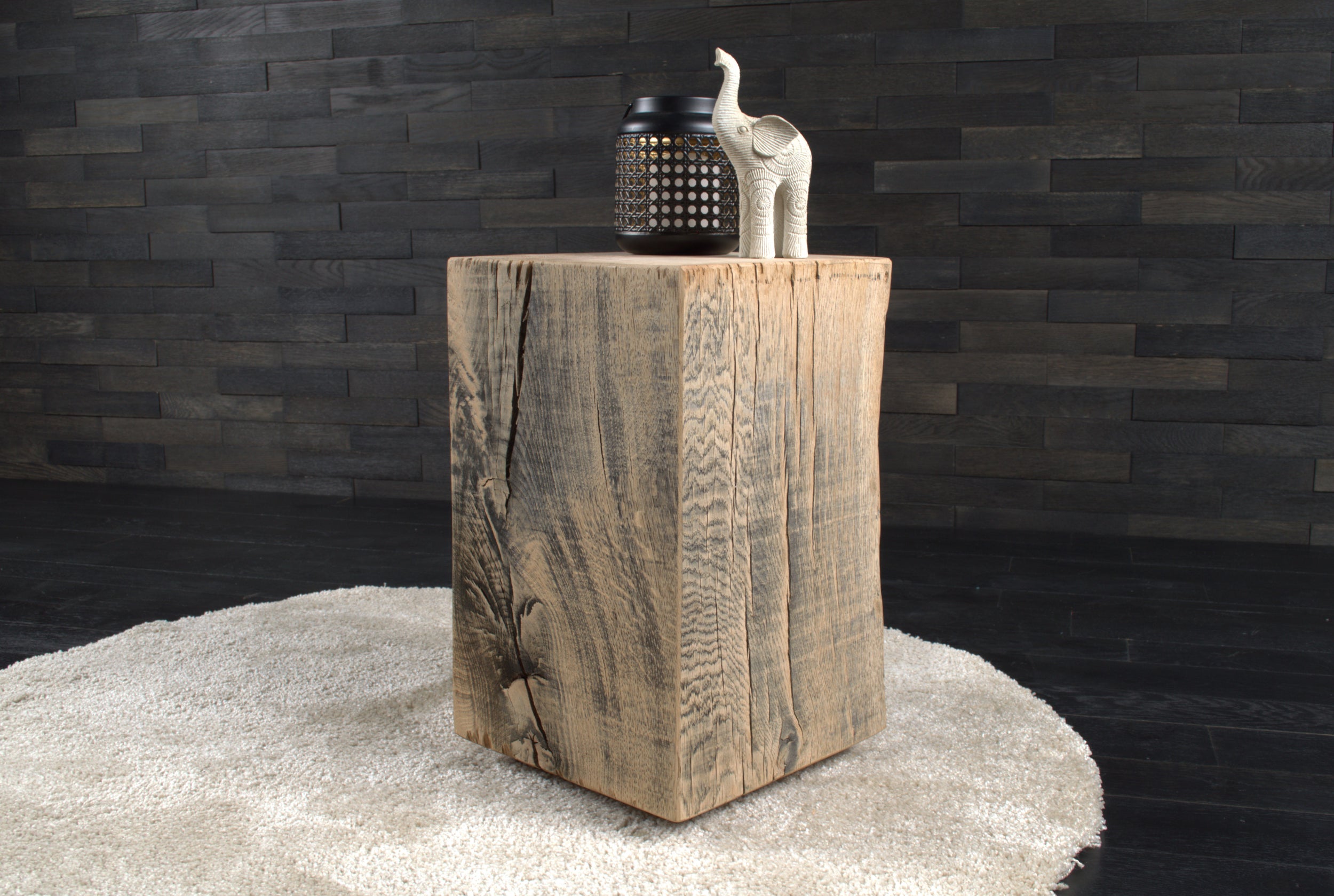 Conçu en chêne massif, chaque bloc présente un veinage unique, avec nœuds et fissures naturelles qui soulignent l’authenticité du matériau. Son format (300 x 300 mm, hauteur 450 mm) s’intègre facilement dans tous les espaces.