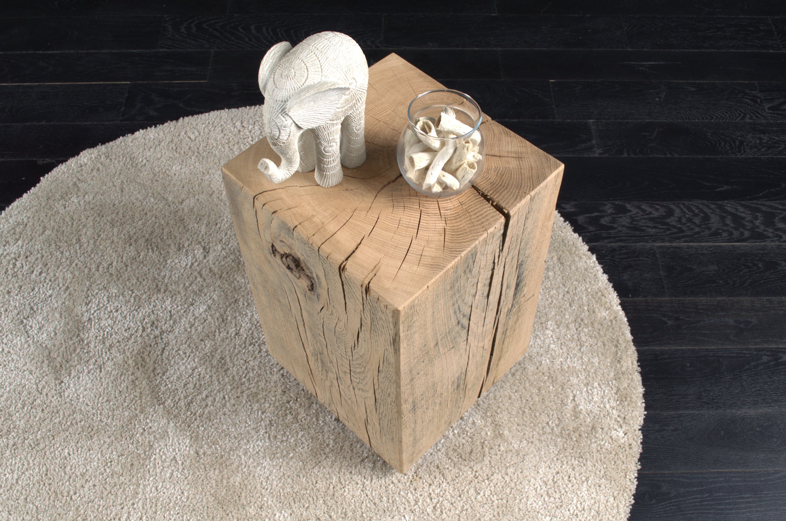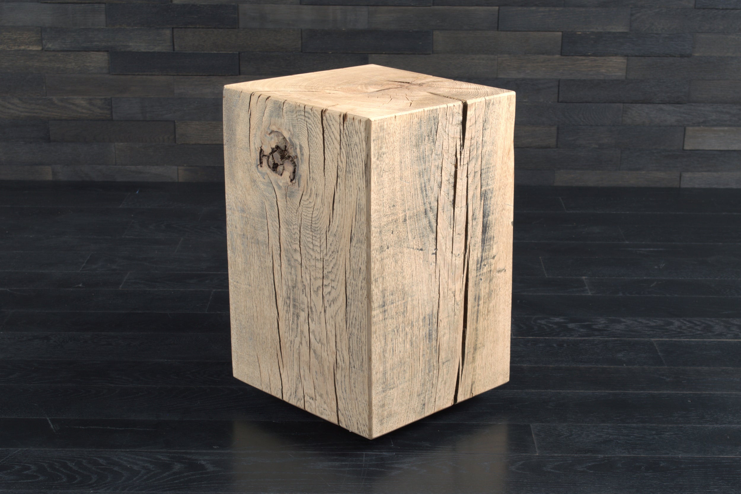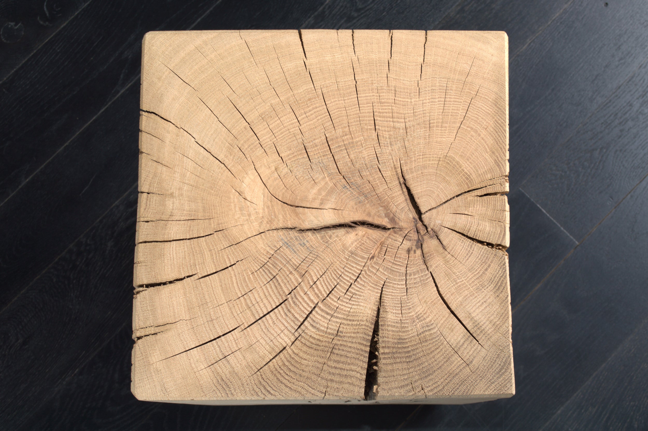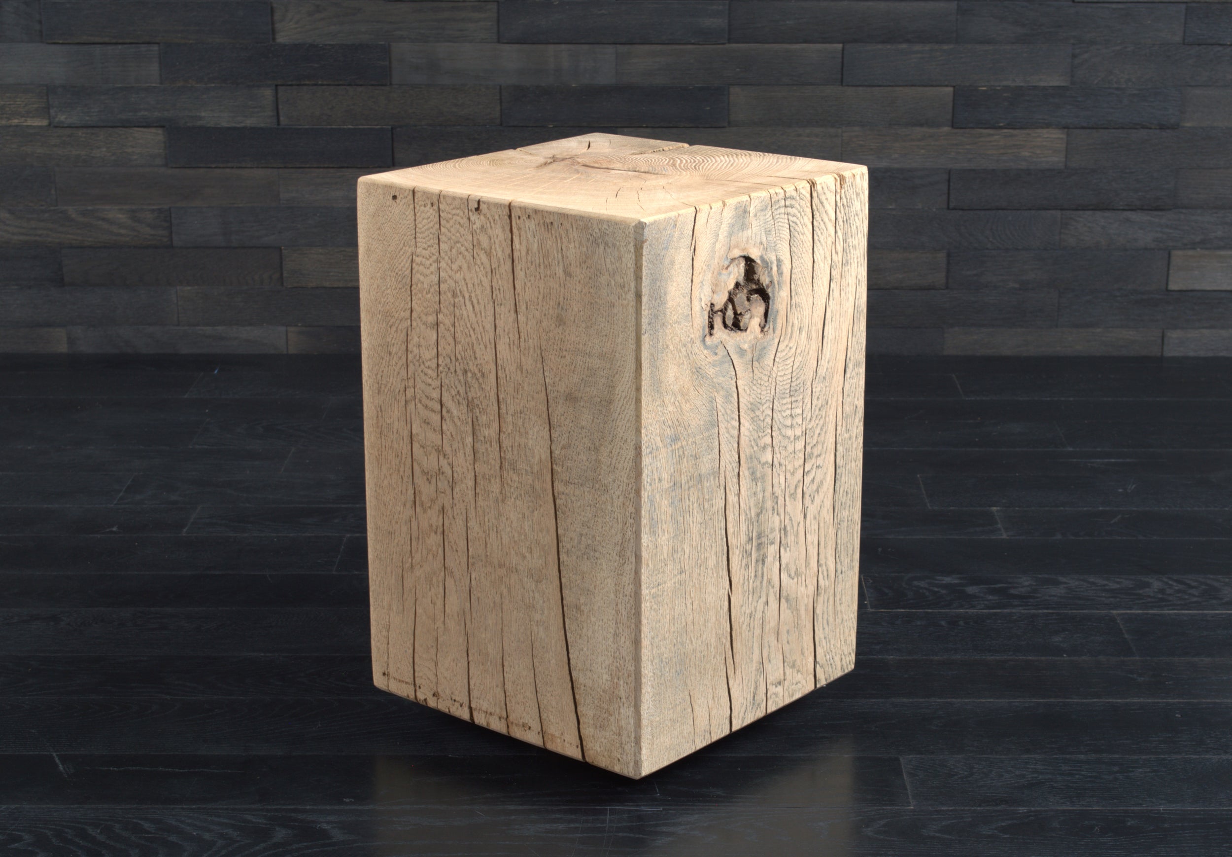 Conçu en chêne massif, chaque bloc présente un veinage unique, avec nœuds et fissures naturelles qui soulignent l’authenticité du matériau. Son format (300 x 300 mm, hauteur 450 mm) s’intègre facilement dans tous les espaces.