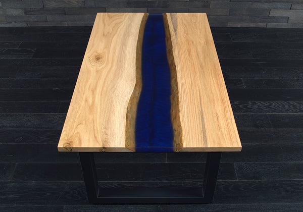 Découvrez l’alliance parfaite de l’élégance naturelle du chêne massif français et de la modernité de la résine bleu magnifiquement intégrée.