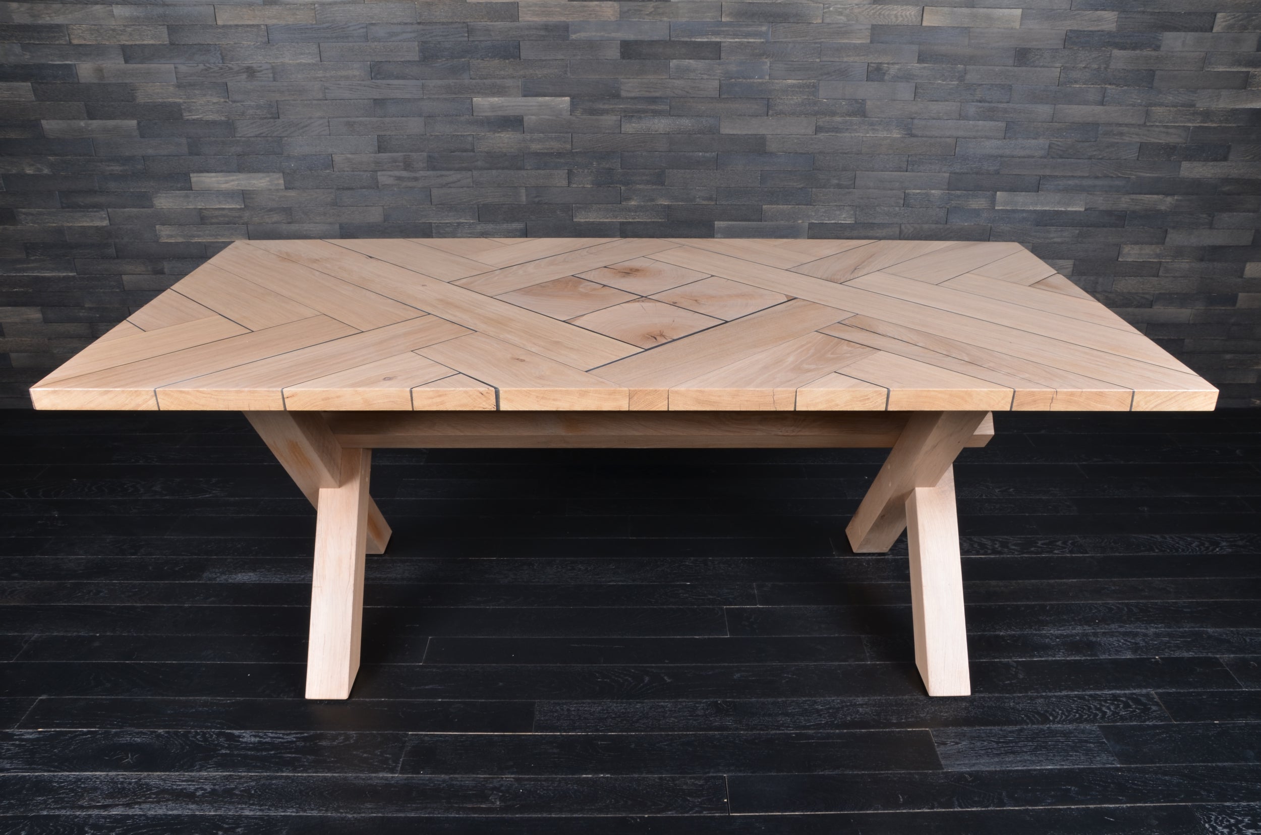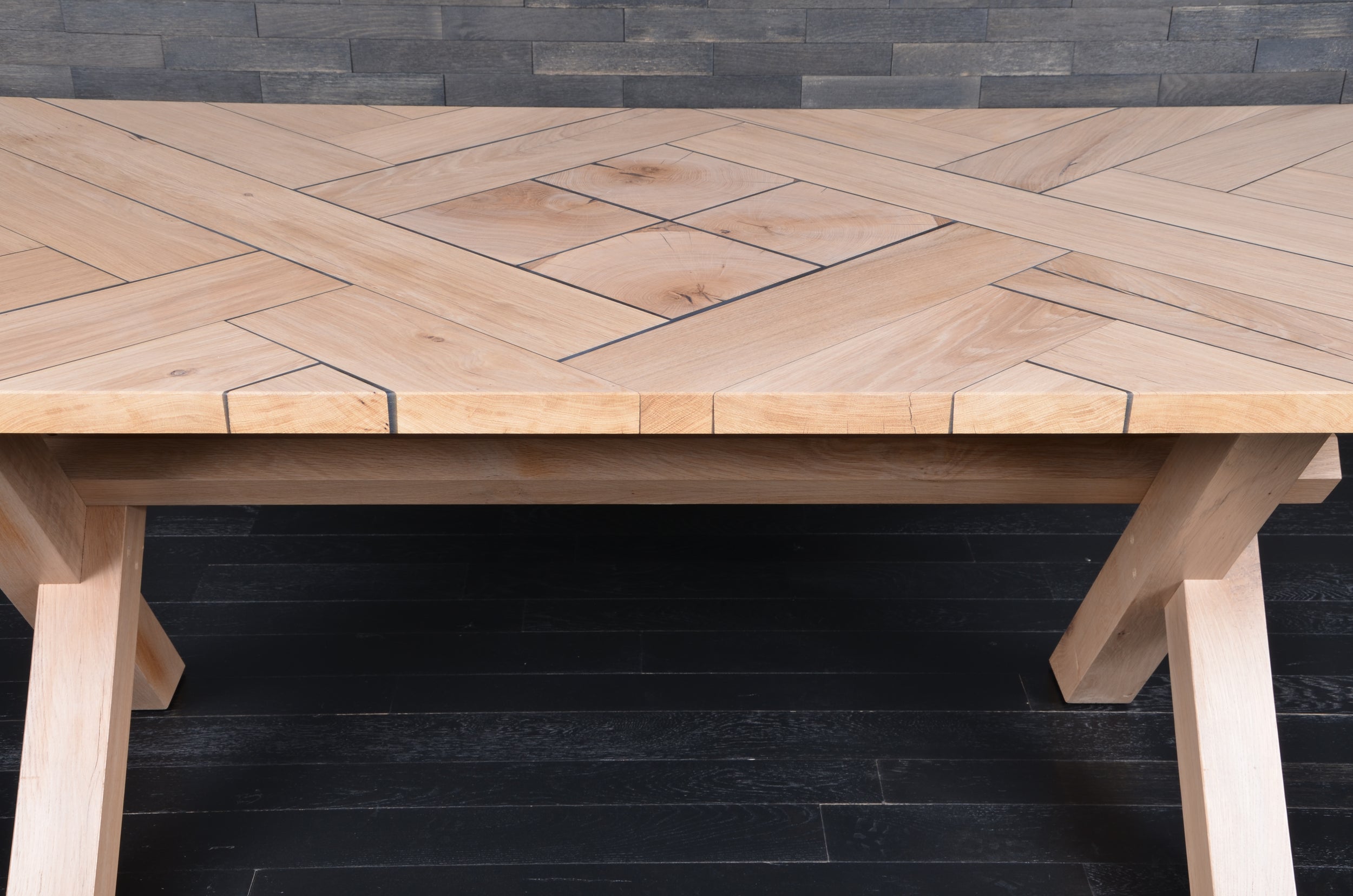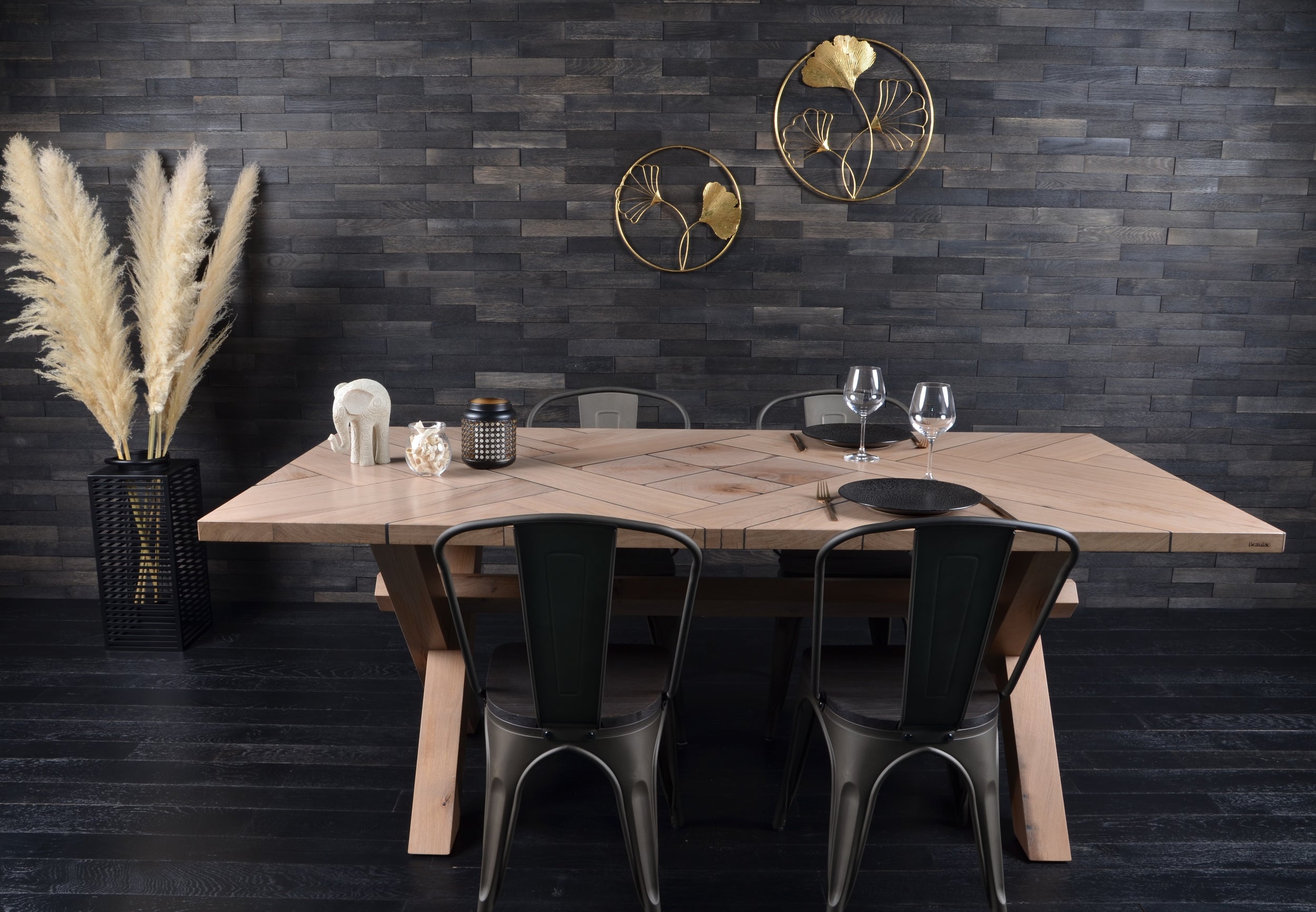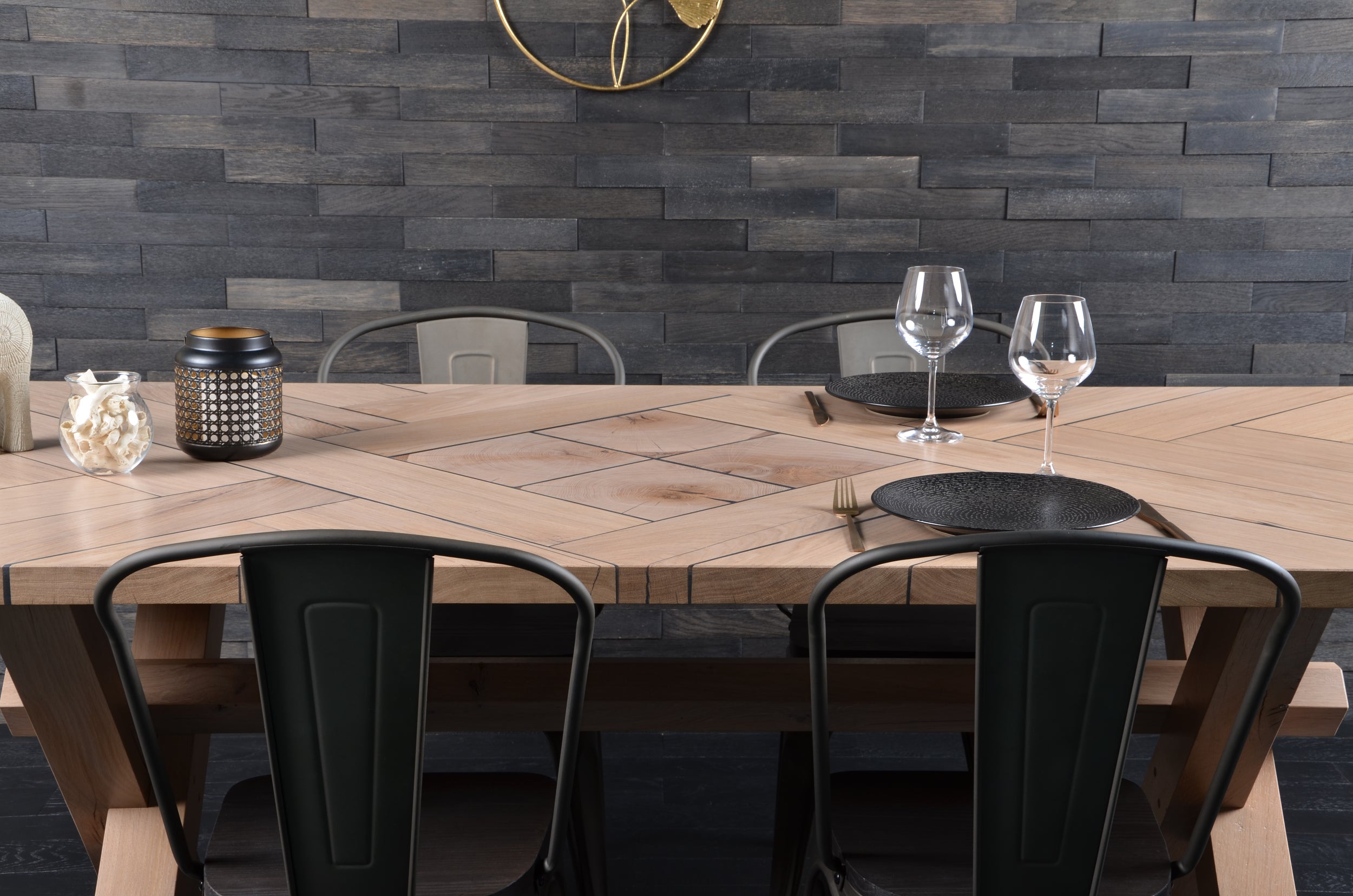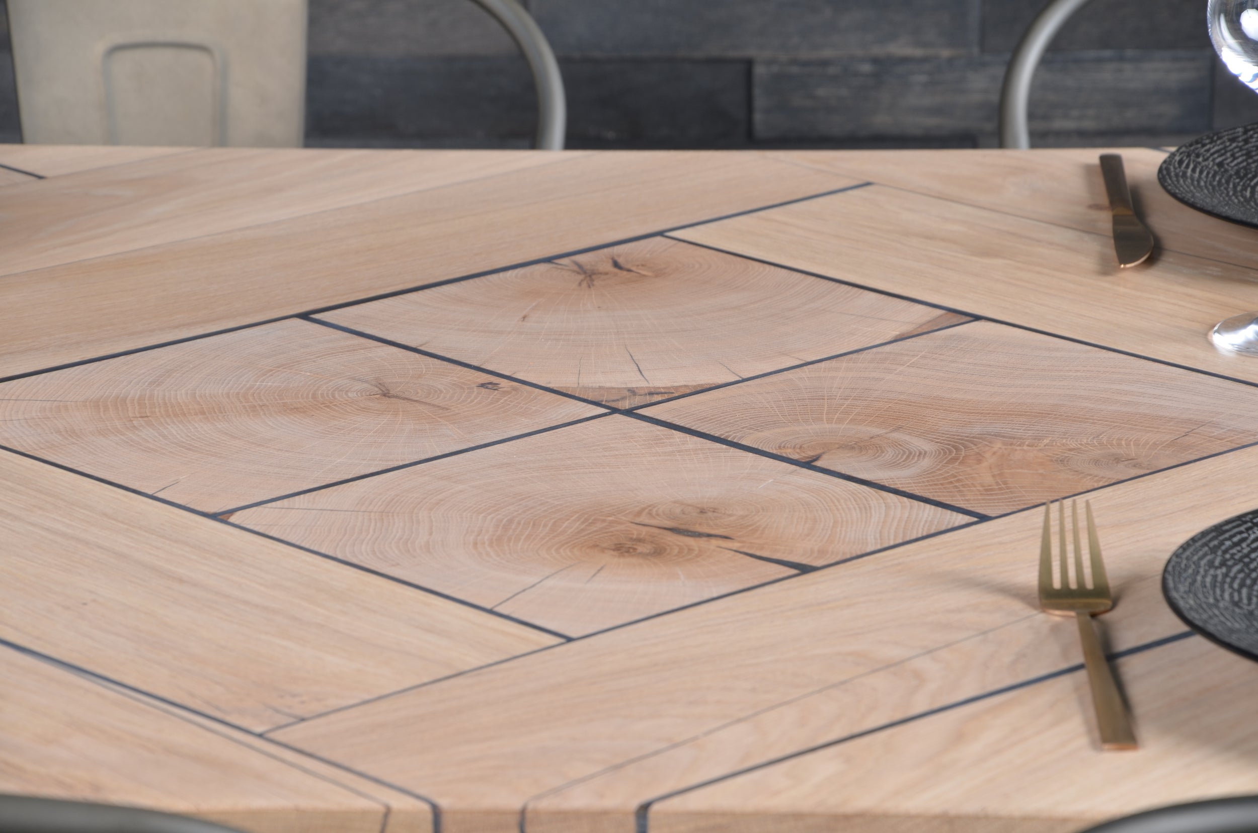 Cette table artisanale en chêne massif, aux dimensions généreuses de 1995 x 995 mm pour une hauteur de 750 mm, peut accueillir de 6 à 8 convives. Son plateau de 40 mm d’épaisseur présente un design inspiré des parquets « bâton rompu », mis en valeur par notre résine BLACKICE, qui apporte un contraste moderne et raffiné.