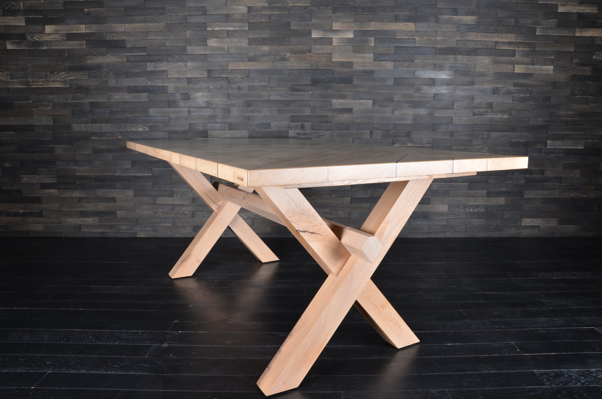 Le pied en forme de X, également réalisé en chêne massif, assure stabilité, robustesse et harmonie avec le plateau. Il est façonné artisanalement pour garantir une finition parfaite.